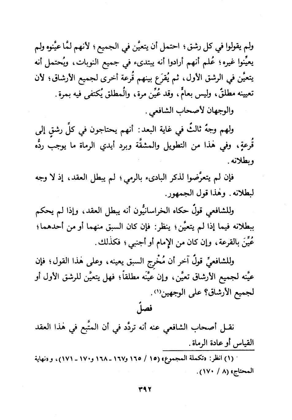 نقل أَصْحَاب الشَّافِعِي عَنهُ أَنه تردد فِي أَن المتبع فِي هَذَا العقد الْقيَاس أَو عَادَة الرُّمَاة