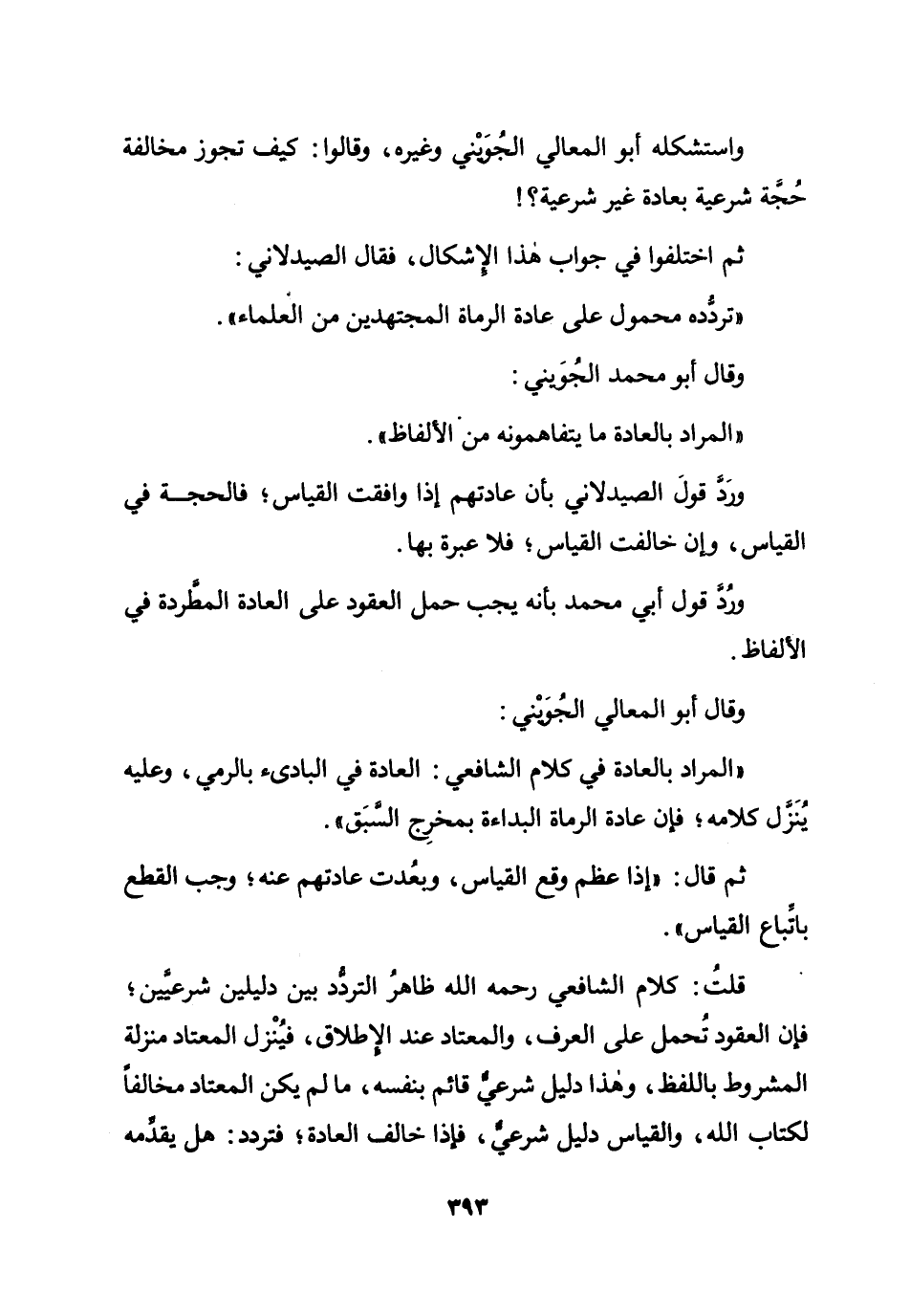 وَاسْتَشْكَلَهُ أَبُو الْمَعَالِي الْجُوَيْنِيّ وَغَيره وَقَالُوا كَيفَ تجوز مُخَالفَة حجَّة شَرْعِيَّة بعادة غير شَرْعِيَّة