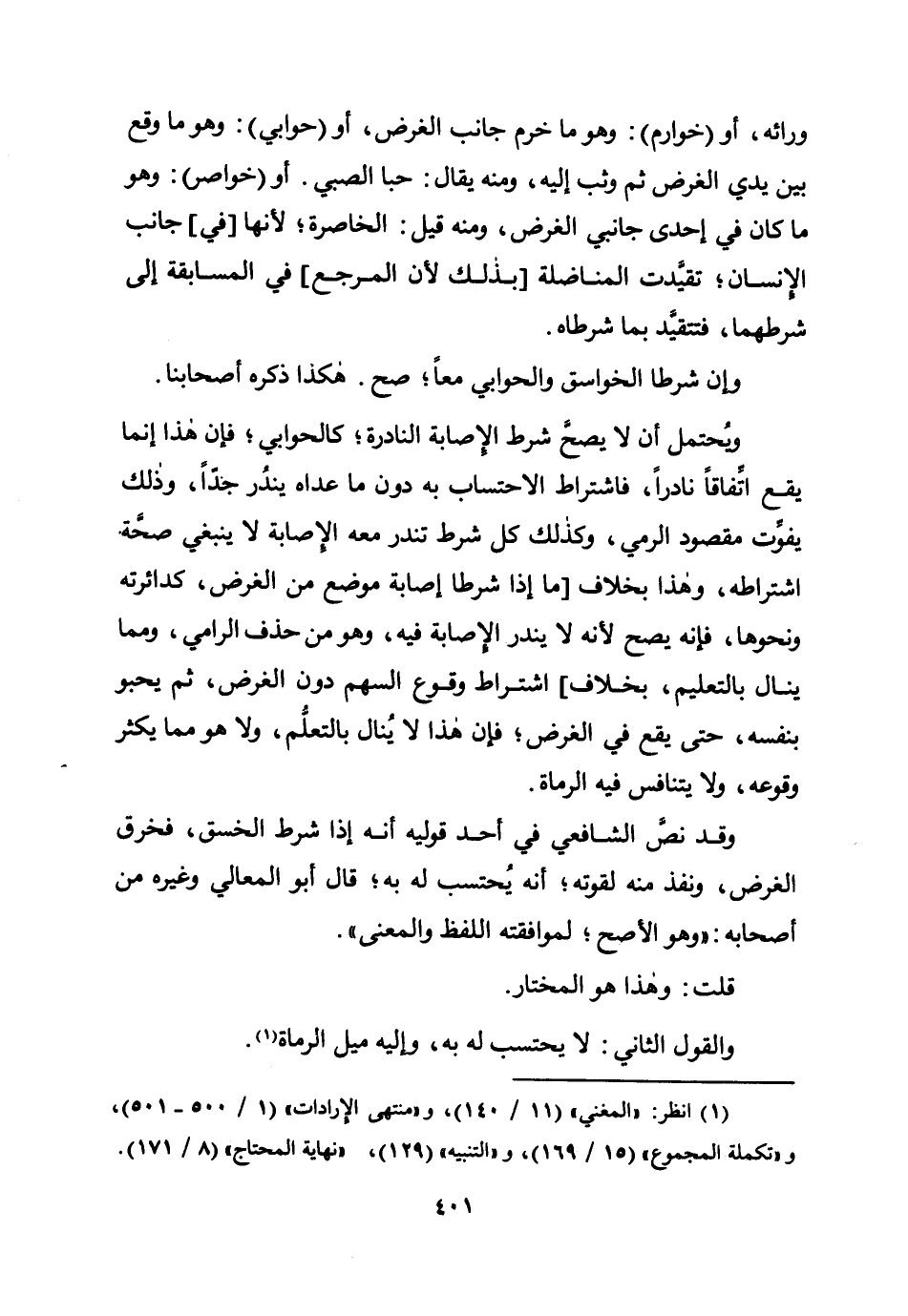 وَرَائه أَو (خوارم) وَهُوَ مَا خرم جَانب الْغَرَض أَو (حوابي) وَهُوَ مَا وَقع بَين يَدي الْغَرَض ثمَّ وثب إِلَيْهِ وَمِنْه يُقَال حبا الصَّبِي أَو (خواصر) وَهُوَ مَا كَانَ فِي إِحْدَى جَانِبي الْغَرَض وَمِنْه قيل الخاصرة لِأَنَّهَا فِي جَانب الْإِنْسَان تقيدت المناضلة بذلك لِأَن الْمرجع فِي الْمُسَابقَة إِلَى شَرطهمَا فتتقيد بِمَا شرطاه