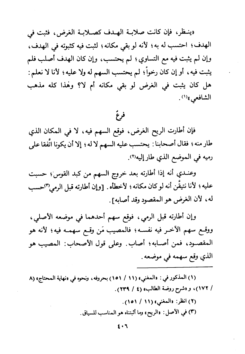 ينظر فَإِن كَانَت صلابة الهدف كصلابة الْغَرَض فَثَبت فِي الهدف احتسب لَهُ بِهِ لِأَنَّهُ لَو بَقِي مَكَانَهُ لثبت فِيهِ كثبوته فِي الهدف وَإِن لم يثبت فِيهِ مَعَ التَّسَاوِي لم يحْتَسب وَإِن كَانَ الهدف أَصْلَب فَلم يثبت فِيهِ أَو إِن كَانَ رخوا لم يحْتَسب السهْم لَهُ وَلَا عَلَيْهِ لأَنا لَا نعلم هَل كَانَ يثبت فِي الْغَرَض لَو بَقِي مَكَانَهُ أم لَا وَهَذَا كُله مَذْهَب الشَّافِعِي (فرع)