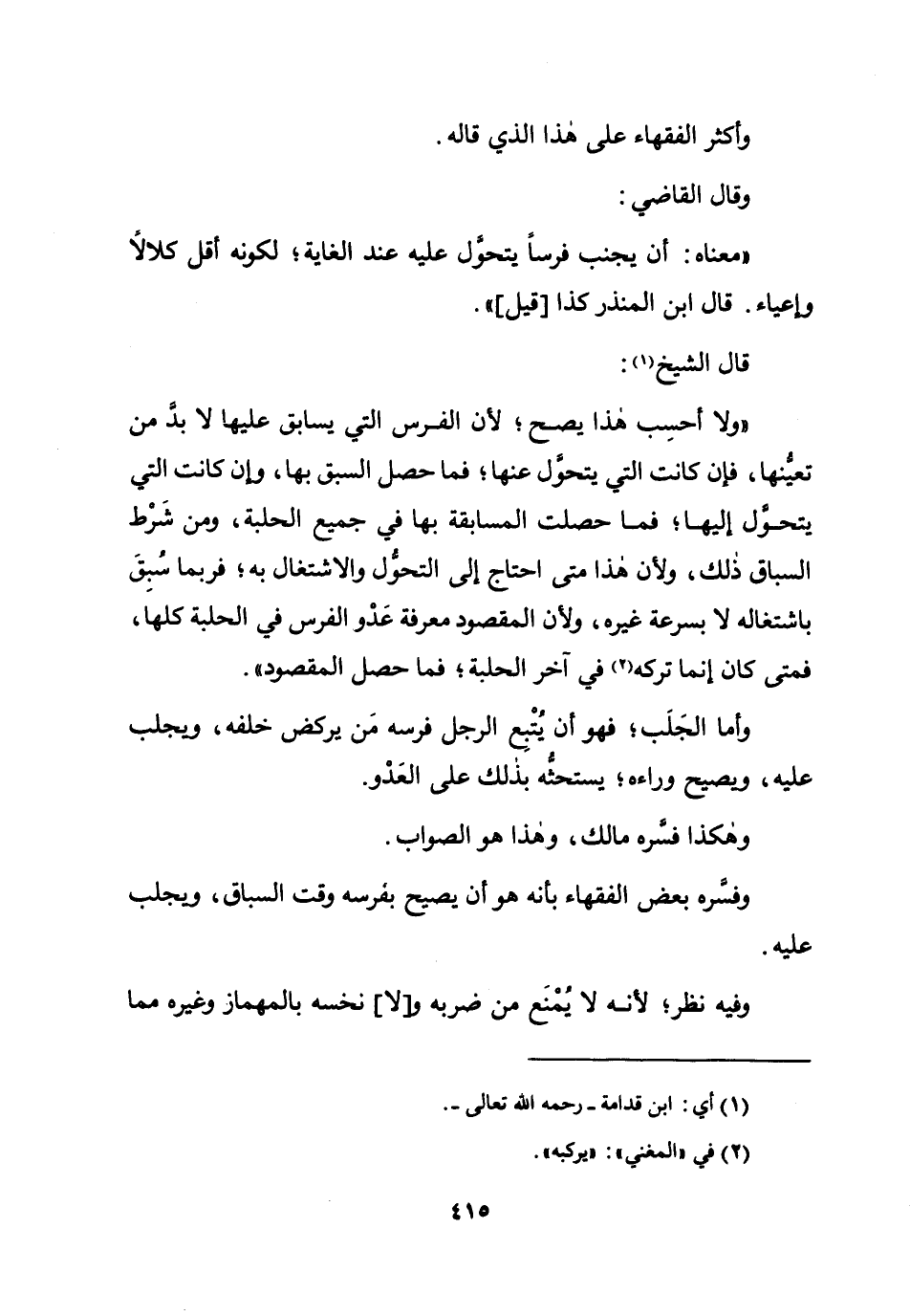 وَلَا أَحسب هَذَا يَصح لِأَن الْفرس الَّتِي يسابق عَلَيْهَا لَا بُد من تعينها فَإِن كَانَت الَّتِي تحول عَنْهَا فَمَا حصل السَّبق بهَا وَإِن كَانَت الَّتِي يتَحَوَّل إِلَيْهَا فَمَا حصلت الْمُسَابقَة بهَا فِي جَمِيع الحلبة وَمن شَرط السباق ذَلِك وَلِأَن هَذَا مَتى احْتَاجَ إِلَى التَّحَوُّل والاشتغال بِهِ فَرُبمَا سبق باشتغاله لَا بِسُرْعَة غَيره وَلِأَن الْمَقْصُود معرفَة عَدو الْفرس فِي الحلبة كلهَا فَمَتَى كَانَ إِنَّمَا تَركه فِي آخر الحلبة فَمَا حصل الْمَقْصُود