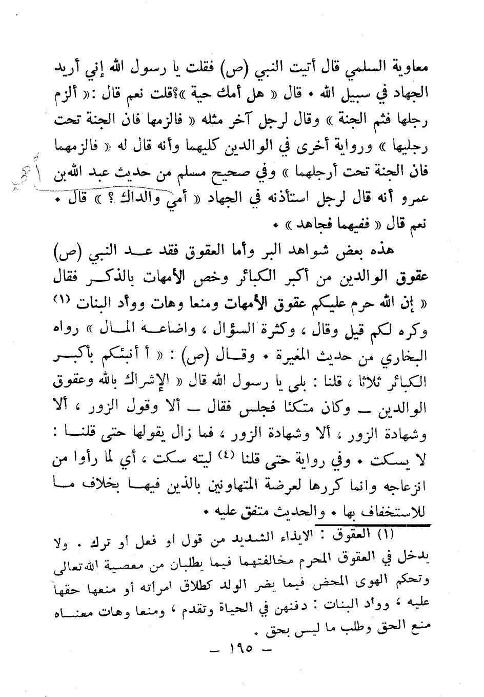 عن معاوية السلمي قال: أتيت النبي A فقلت: يا رسول الله إني أريد الجهاد في سبيل الله فقال: " هل أمك حية " قلت: نعم قال: " ألزم رجلها فثم الجنة " وقال لرجل آخر مثله: " فالزمها فإن الجنة تحت رجليها "