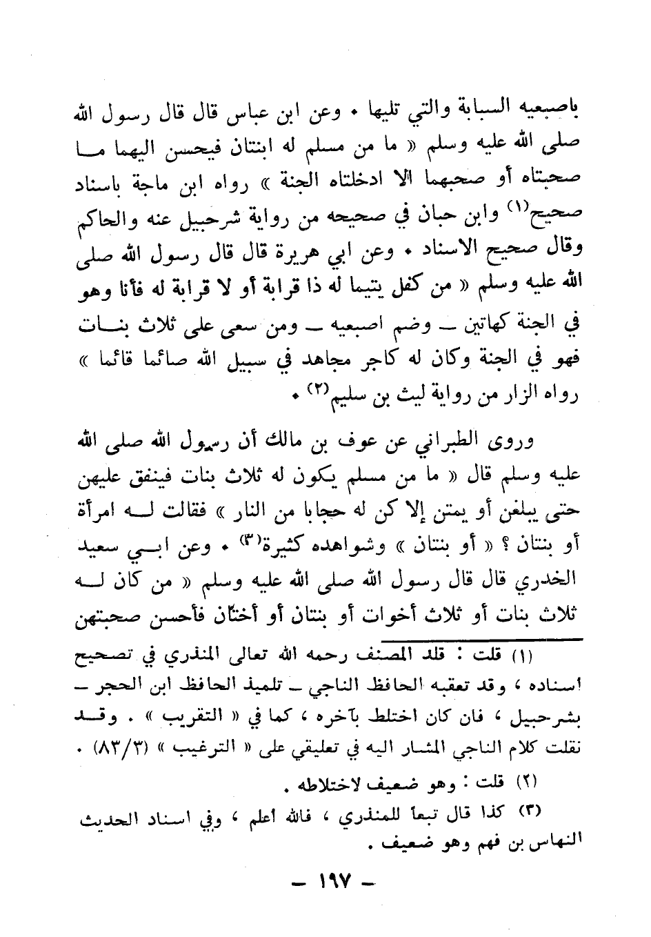عن عوف بن مالك عن النبي A قال: " ما من مسلم يكون له ثلاث بنات فينفق عليهن حتى يبلغن أو يموتن إلا كن له حجابا من النار " فقالت له امرأة: أو بنتان؟ قال: " أو بنتان "