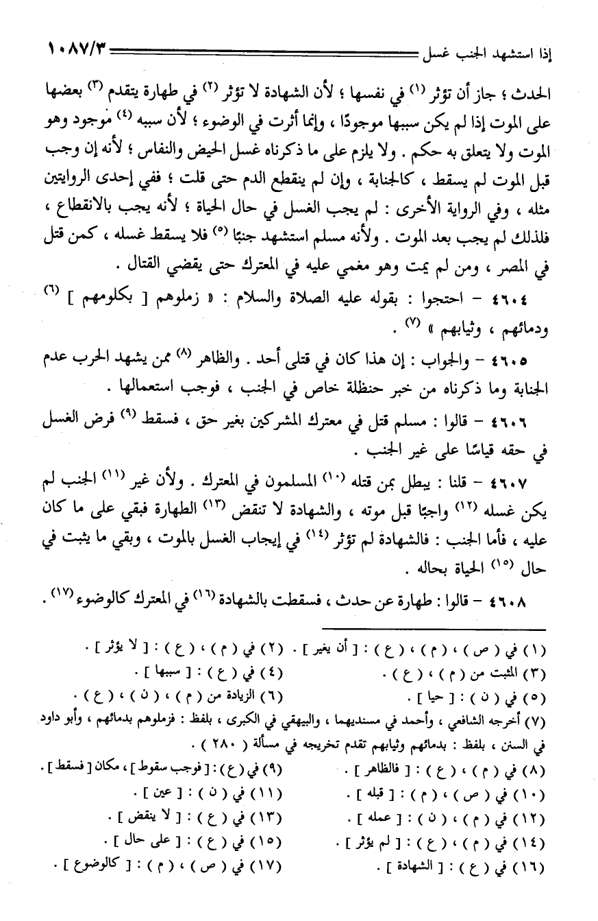 4607 - قلنا: يبطل بمن قتله المسلمون في المعترك. ولأن غير الجنب لم يكن غسله واجبا قبل موته، والشهادة لا تنقض الطهارة فبقي على ما كان عليه، فأما الجنب: فالشهادة لم تؤثر في إيجاب الغسل بالموت، وبقي ما يثبت في حال الحياة بحاله.