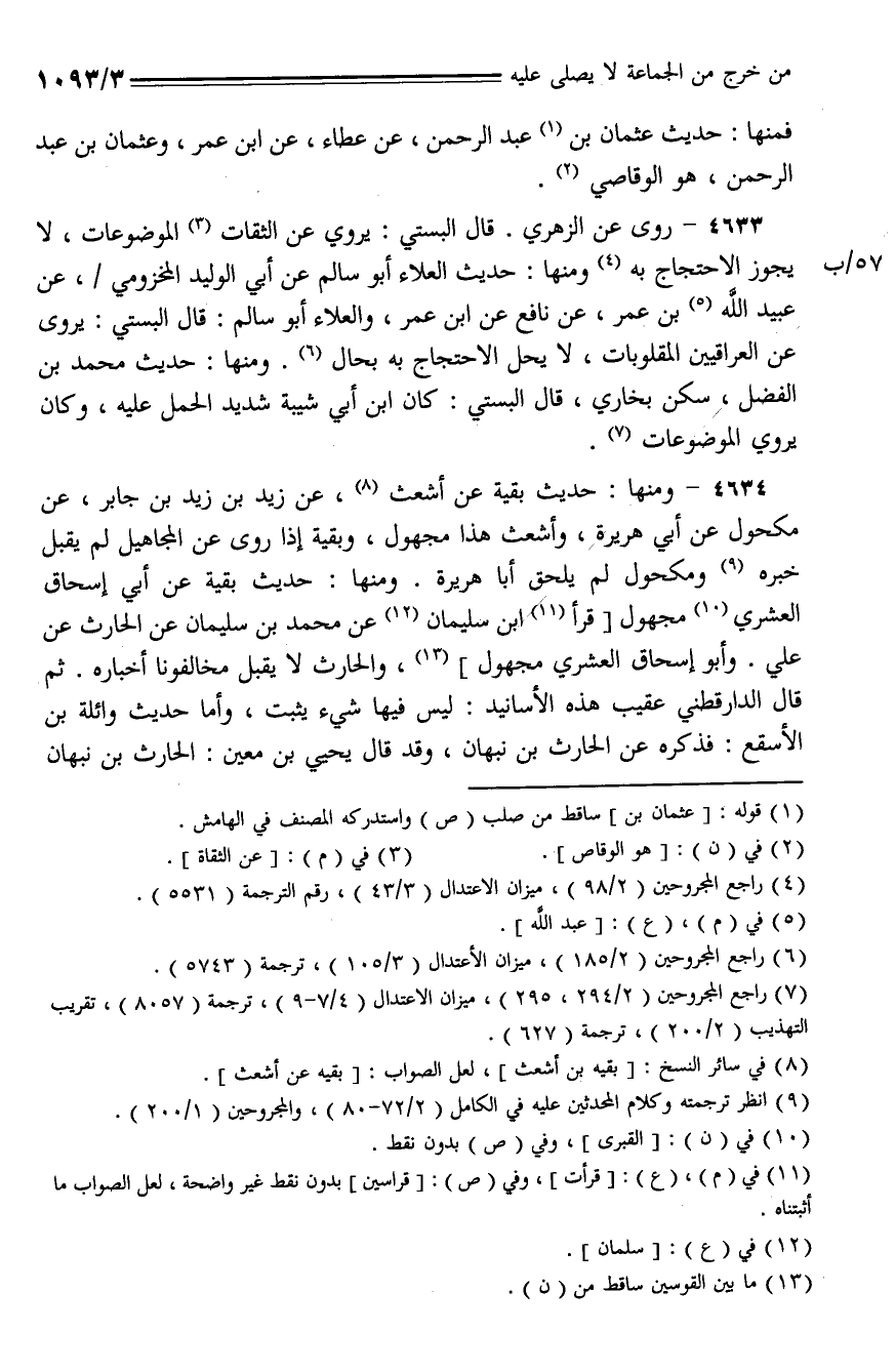 4634 - ومنها: حديث بقية عن أشعث، عن زيد بن زيد بن جابر، عن مكحول عن أبي هريرة، وأشعث هذا مجهول، وبقية إذا روى عن المجاهيل لم يقبل خبره ومكحول لم يلحق أبا هريرة. ومنها: حديث بقية عن أبي إسحاق العشري مجهول [قرأ ابن سليمان عن محمد بن سليمان عن الحارث عن علي. وأبو إسحاق العشري مجهول]، والحارث لا يقبل مخالفونا أخباره. ثم قال الدارقطني عقيب هذه الأسانيد: ليس فيها شيء يثبت، وأما حديث وائلة بن الأسقع: فذكره عن الحارث بن نبهان، وقد قال يحيى بن معين: الحارث بن نبهان