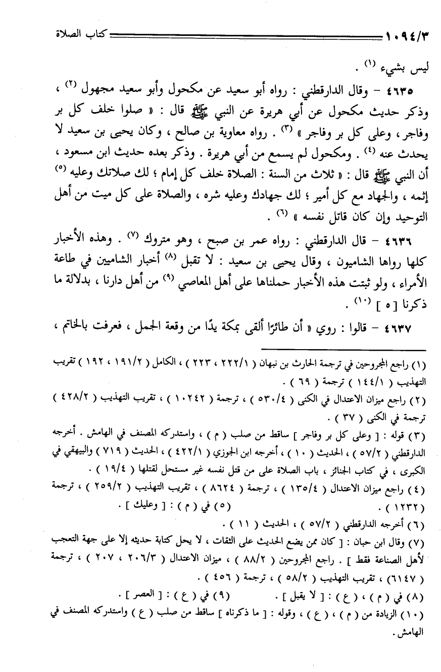 4635 - وقال الدارقطني: رواه أبو سعيد عن مكحول وأبو سعيد مجهول، وذكر حديث مكحول عن أبي هريرة عن النبي - صلى الله عليه وسلم - قال: (صلوا خلف كل بر وفاجر، وعلى كل بر وفاجر). رواه معاوية بن صالح، وكان يحيى بن سعيد لا يحدث عنه. ومكحول لم يسمع من أبي هريرة. وذكر بعده حديث ابن مسعود، أن النبي - صلى الله عليه وسلم - قال: (ثلاث من السنة: الصلاة خلف كل إمام؛ لك صلاتك وعليه إثمه، والجهاد مع كل أمير؛ لك جهادك وعليه شره، والصلاة على كل ميت من أهل التوحيد وإن كان قاتل نفسه).