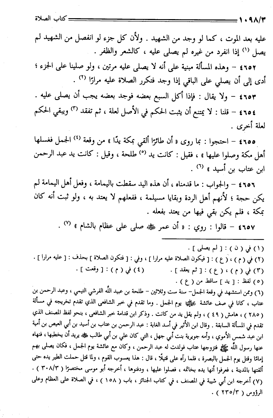 4655 - احتجوا: بما روي (أن طائرا ألقى بمكة يدا) من وقعة الجمل فغسلها أهل مكة وصلوا عليها)، فقيل: كانت يد طلحة، وقيل: كانت يد عبد الرحمن ابن عتاب بن أسيد).