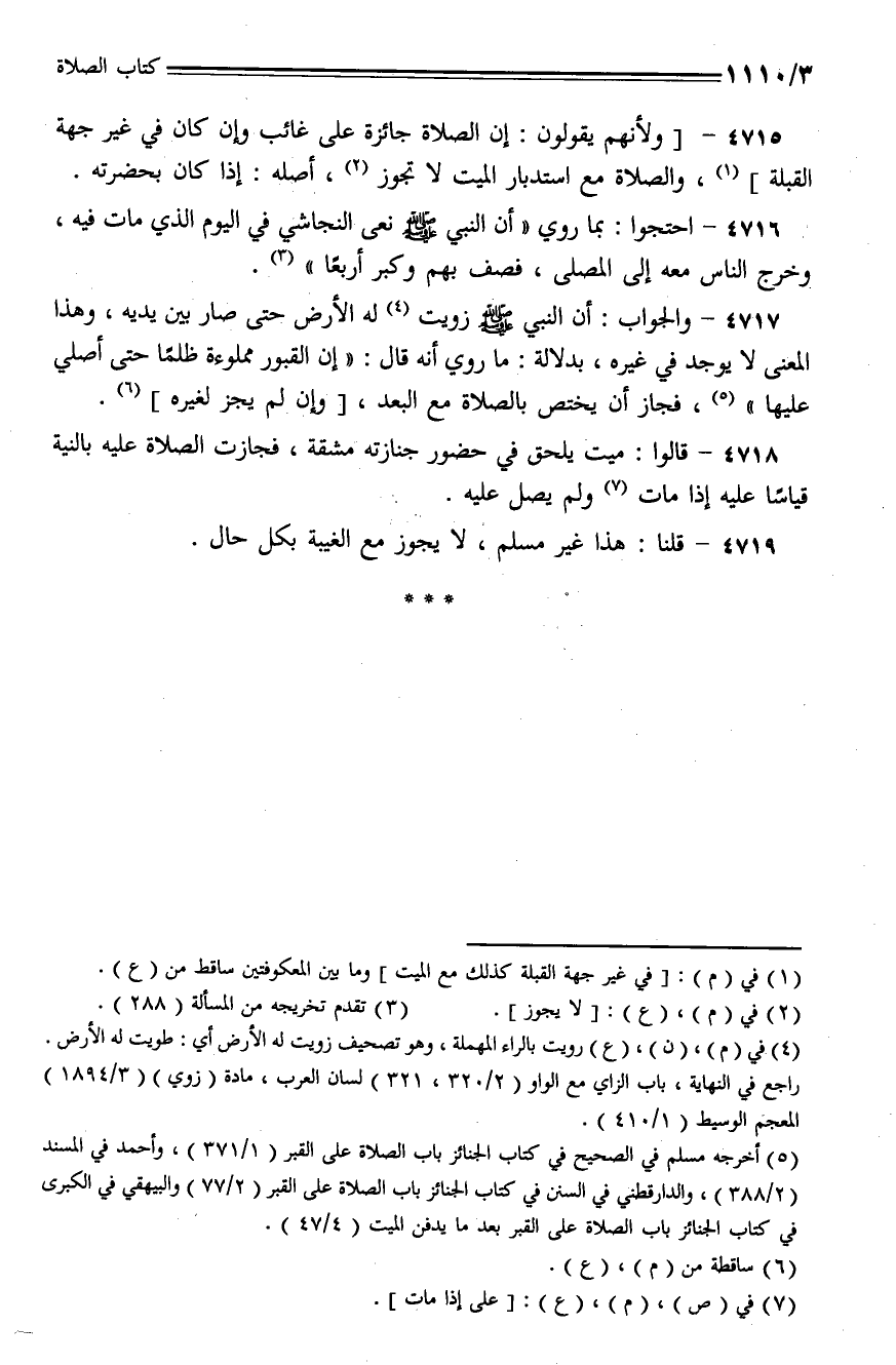 4718 - قالوا: ميت يلحق في حضور جنازته مشقة، فجازت الصلاة عليه بالنية قياسا عليه إذا مات ولم يصل عليه.