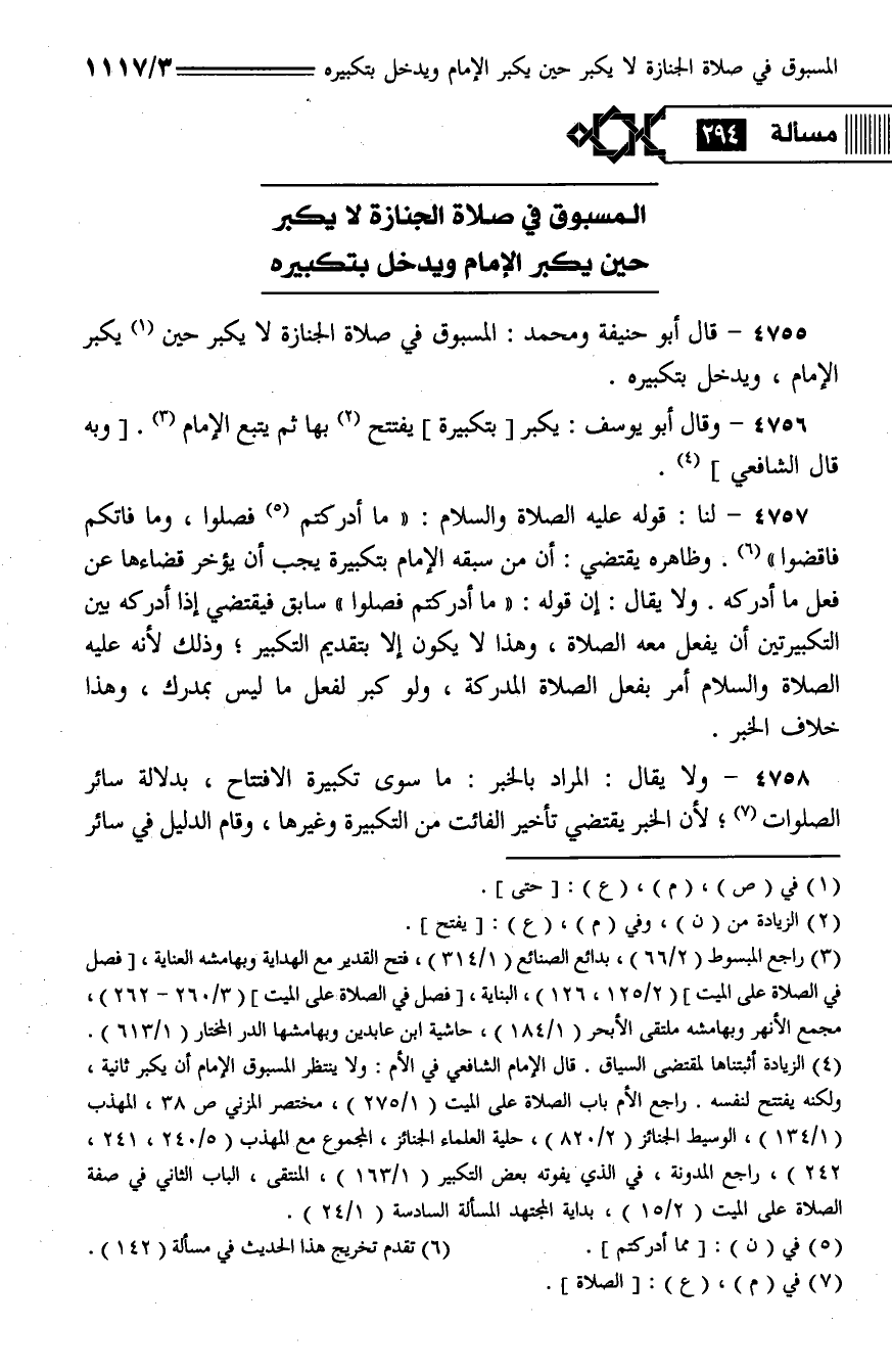 4755 - قال أبو حنيفة ومحمد: المسبوق في صلاة الجنازة لا يكبر حين يكبر الإمام، ويدخل بتكبيره.