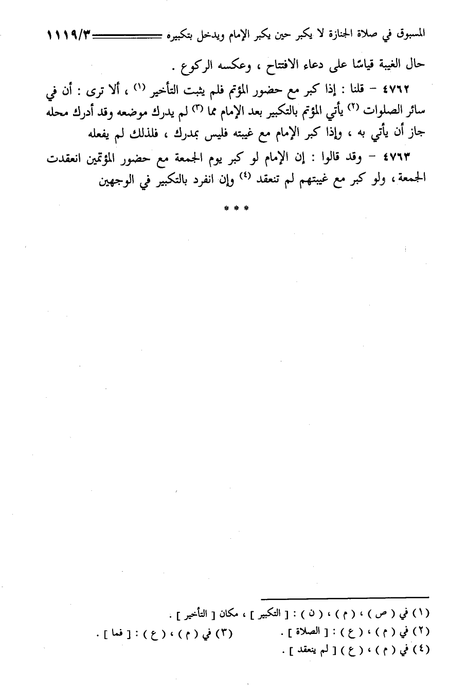4763 - وقد قالوا: إن الإمام لو كبر يوم الجمعة مع حضور المؤتمين انعقدت الجمعة، ولو كبر مع غيبتهم لم تنعقد وإن انفرد بالتكبير في الوجهين.