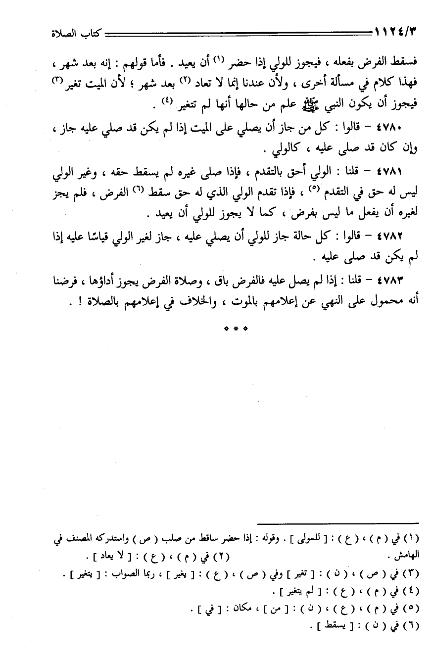 4781 - قلنا: الولي أحق بالتقدم، فإذا صلى غيره لم يسقط حقه، وغير الولي ليس له حق في التقدم، فإذا تقدم الولي الذي له حق سقط الفرض، فلم يجز لغيره أن يفعل ما ليس بفرض، كما لا يجوز للولي أن يعيد.