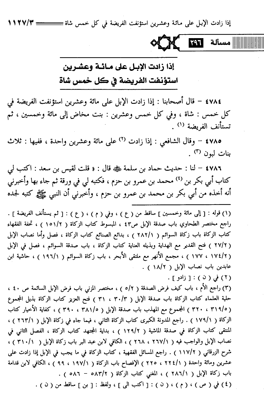 4784 - قال أصحابنا: إذا زادت الإبل على مائة وعشرين استؤنفت الفريضة في كل خمس: شاة، وفي كل خمس وعشرين: بنت مخاض إلى مائة وخمسين، ثم تستأنف الفريضة.