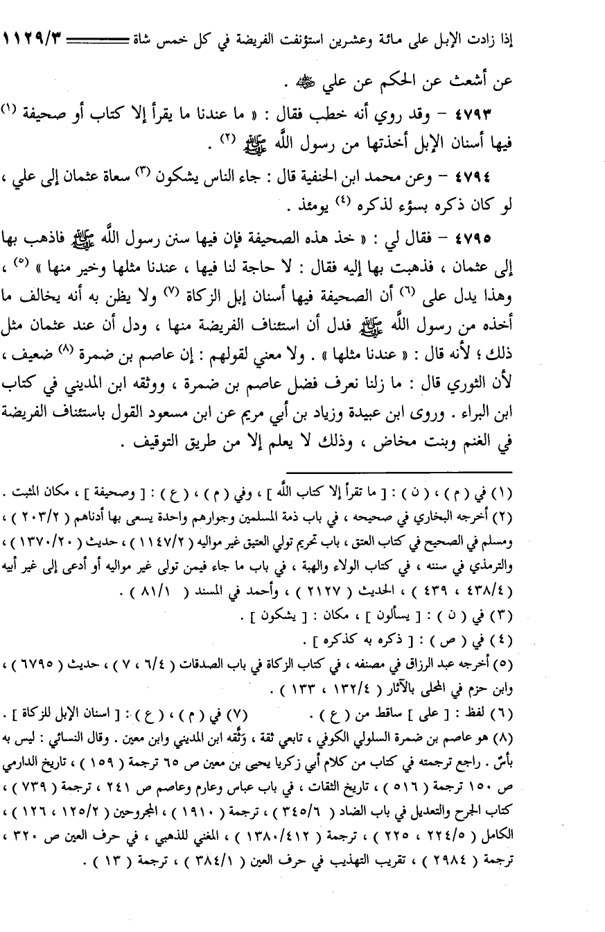 4793 - وقد روي أنه خطب فقال: (ما عندنا ما يقرأ إلا كتاب أو صحيفة فيها أسنان الإبل أخذتها من رسول الله - صلى الله عليه وسلم -.