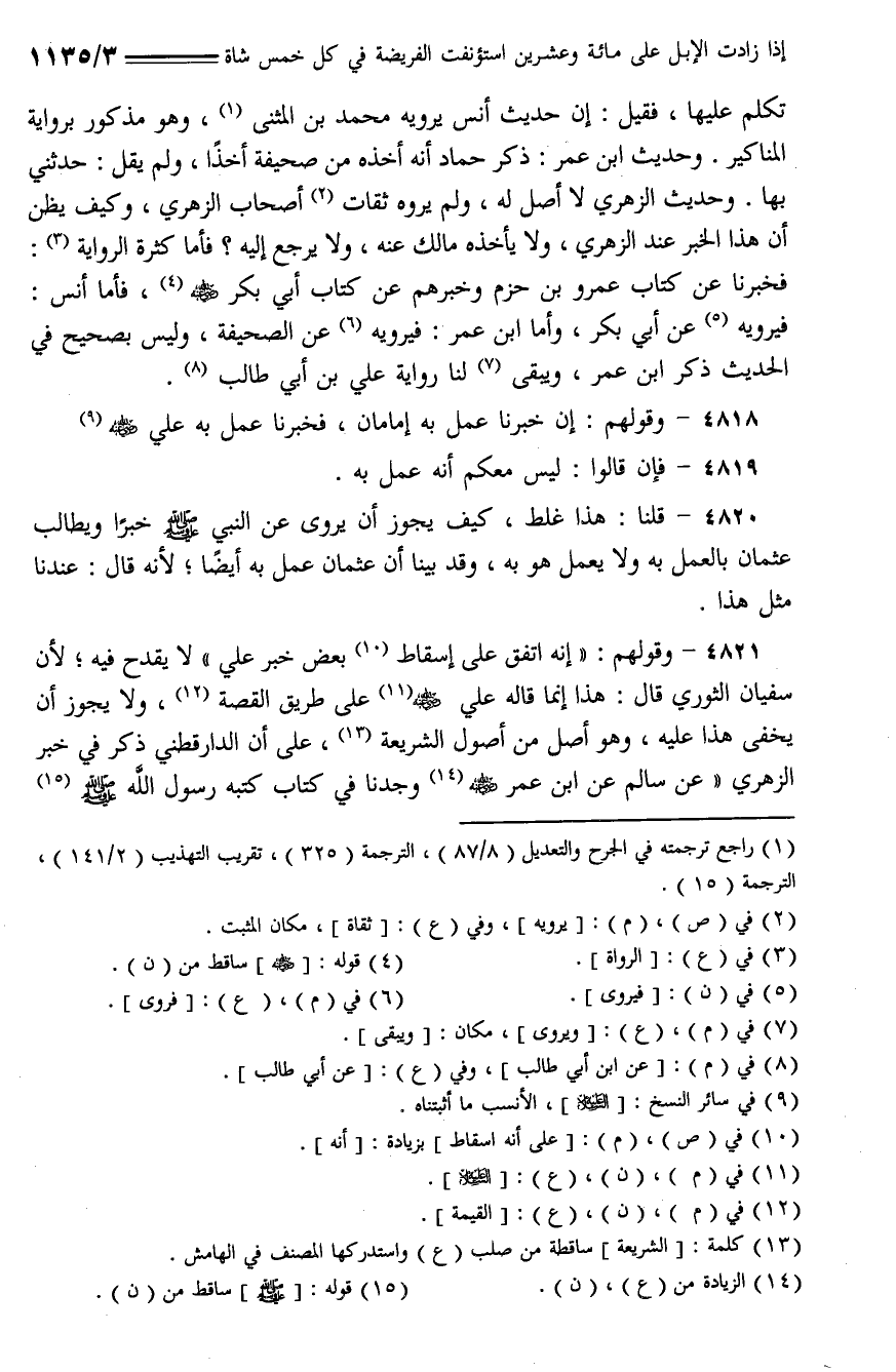 4821 - وقولهم: (إنه اتفق على إسقاط بعض خبر علي) لا يقدح فيه؛ لأن سفيان الثوري قال: هذا إنما قاله علي - رضي الله عنه - على طريق القصة، ولا يجوز أن يخفى هذا عليه، وهو أصل من أصول الشريعة، على أن الدارقطني ذكر في خبر الزهري (عن سالم عن ابن عمر - رضي الله عنه - وجدنا في كتاب كتبه رسول الله - صلى الله عليه وسلم -