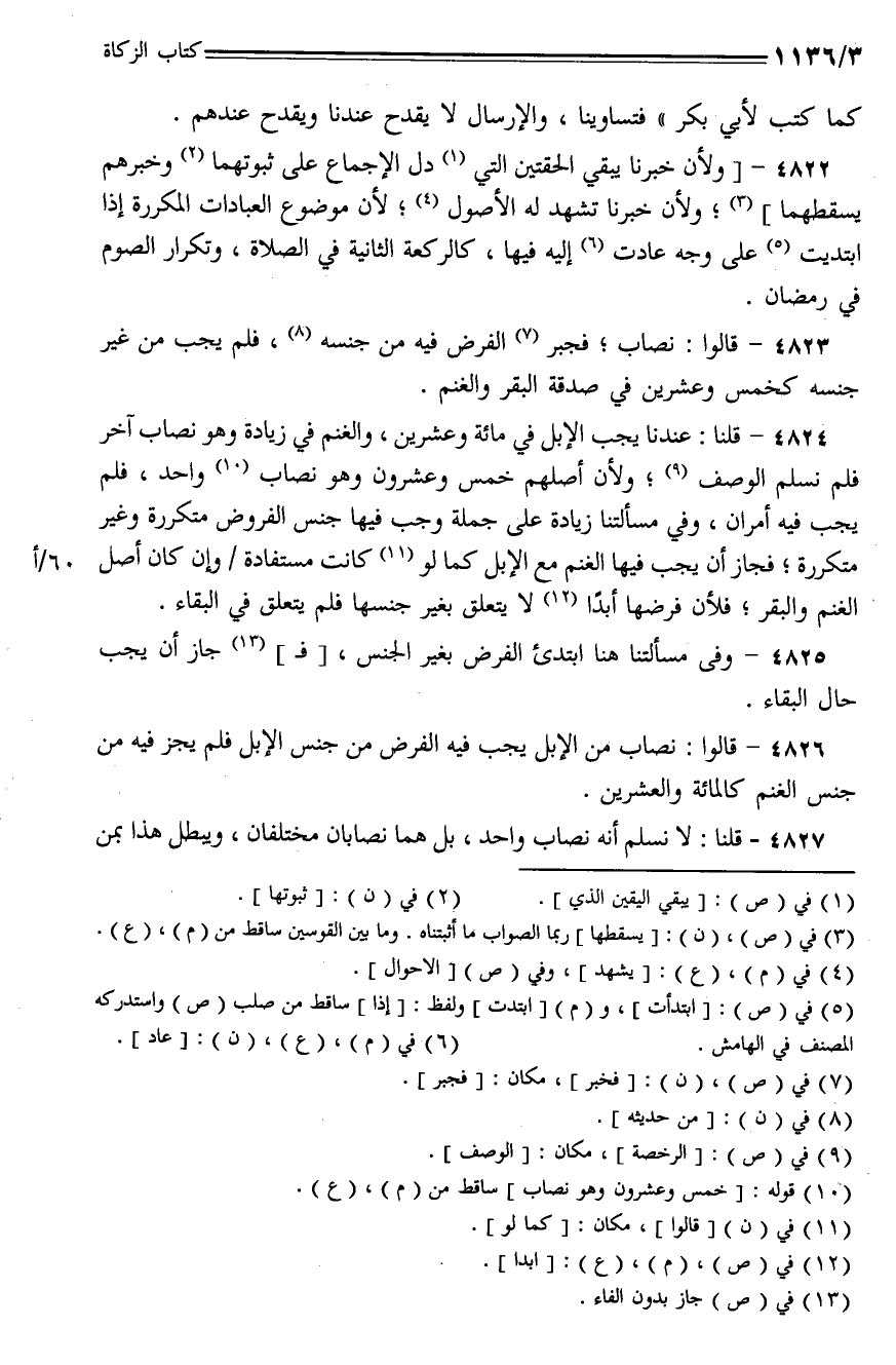 4824 - قلنا: عندنا يجب الإبل في مائة وعشرين، والغنم في زيادة وهو نصاب آخر فلم نسلم الوصف؛ ولأن أصلهم خمس وعشرون وهو نصاب واحد، فلم يجب فيه أمران، وفي مسألتنا زيادة على جملة وجب فيها جنس الفروض متكررة وغير متكررة؛ فجاز أن يجب فيها الغنم مع الإبل كما لو كانت مستفادة وإن كان أصل الغنم والبقر؛ فلأن فرضها أبدا لا يتعلق بغير جنسها فلم يتعلق في البقاء.