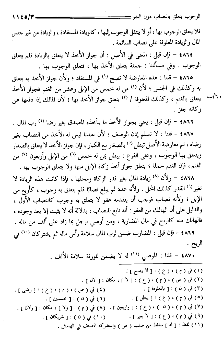 4868 - ولأن زيادة المال بغير قدر الزكاة ومحلها، فإذا كانت هذه الزيادة لا تغير القدر كذلك المحل. ولأنه عدد لم يبلغ نصابا فلم يتعلق به وجوب، كأربع من الإبل؛ ولأنه نصاب فوجب أن يتقدمه عفو لا يتعلق به وجوب كالنصاب الأول، والدليل على أن الهالك من العفو: أنه تابع للنصاب، بدلالة أنه لا يثبت إلا بعد وجوده، فالهالك منه كالربح في مال المضاربة، ومن أوصى لرجل بما زاد على ألف من ماله.