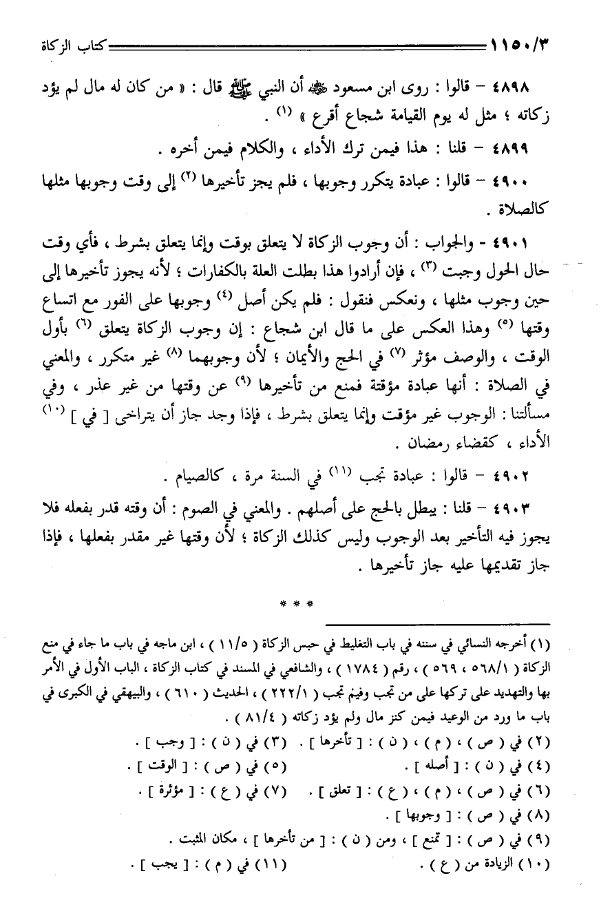 4901 - والجواب: أن وجوب الزكاة لا يتعلق بوقت وإنما يتعلق بشرط، فأي وقت حال الحول وجبت، فإن أرادوا هذا بطلت العلة بالكفارات؛ لأنه يجوز تأخيرها إلى حين وجوب مثلها، ونعكس فنقول: فلم يكن أصل وجوبها على الفور مع اتساع وقتها وهذا العكس على ما قال ابن شجاع: إن وجوب الزكاة يتعلق بأول الوقت، والوصف مؤثر في الحج والأيمان؛ لأن وجوبهما غير متكرر، والمعنى في الصلاة: أنها عبادة مؤقتة فمنع من تأخيرها عن وقتها من غير عذر، وفي مسألتنا: الوجوب غير مؤقت وإنما يتعلق بشرط، فإذا وجد جاز أن يتراخى [في] الأداء، كقضاء رمضان.