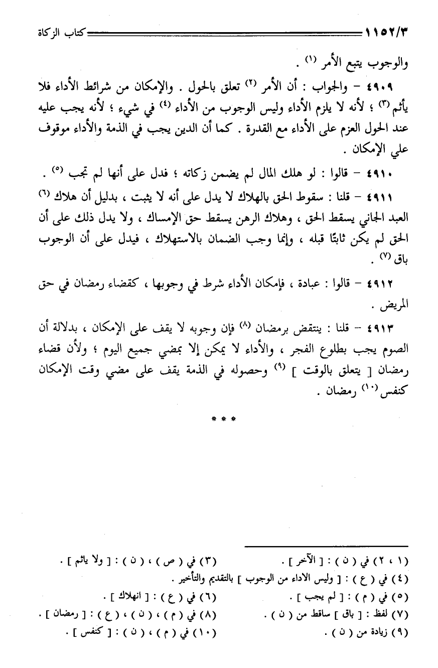 4909 - والجواب: أن الأمر تعلق بالحول. والإمكان من شرائط الأداء فلا يأثم؛ لأنه لا يلزم الأداء وليس الوجوب من الأداء في شيء؛ لأنه يجب عليه عند الحول العزم على الأداء مع المقدرة. كما أن الدين يجب في الذمة والأداء موقوف على الإمكان.