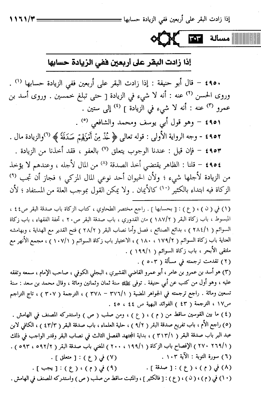 4950 - قال أبو حنيفة: إذا زادت البقر على أربعين ففي الزيادة حسابها. وروى الحسن عنه: أنه لا شيء في الزيادة [حتى تبلغ خمسين. وروى أسد بن عمرو عنه: أنه لا شيء في الزيادة] إلى ستين.