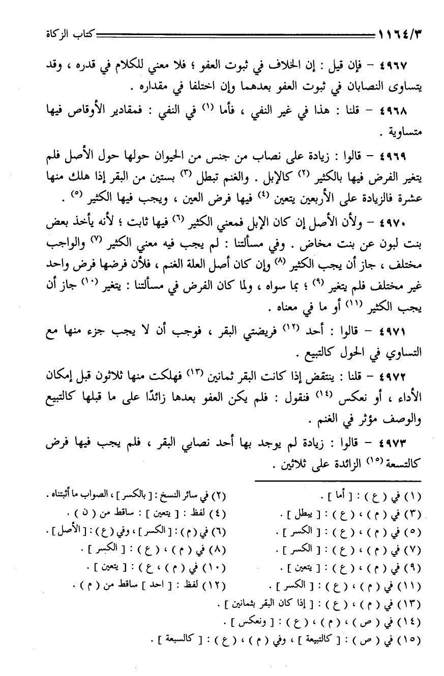 4969 - قالوا: زيادة على نصاب من جنس من الحيوان حولها حول الأصل فلم يتغير الفرض فيها بالكثير كالإبل. والغنم تبطل بستين من البقر إذا هلك منها عشرة فالزيادة على الأربعين يتعين فيها فرض العين، ويجب فيها الكثير.
