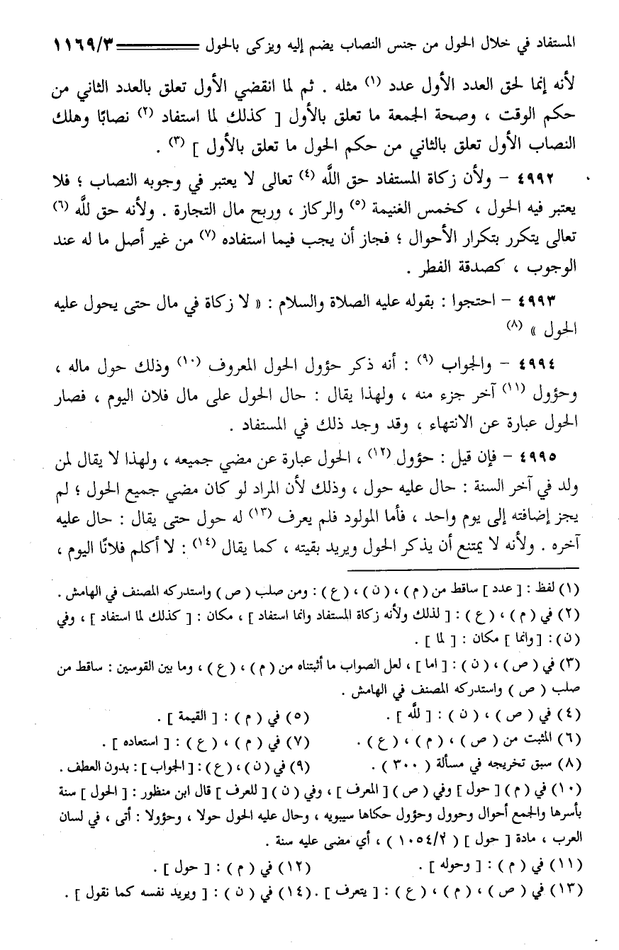 4994 - والجواب: أنه ذكر حؤول الحول المعروف وذلك حول ماله، وحؤول آخر جزء منه، ولهذا يقال: حال الحول على مال فلان اليوم، فصار الحول عبارة عن الانتهاء، وقد وجد ذلك في المستفاد.