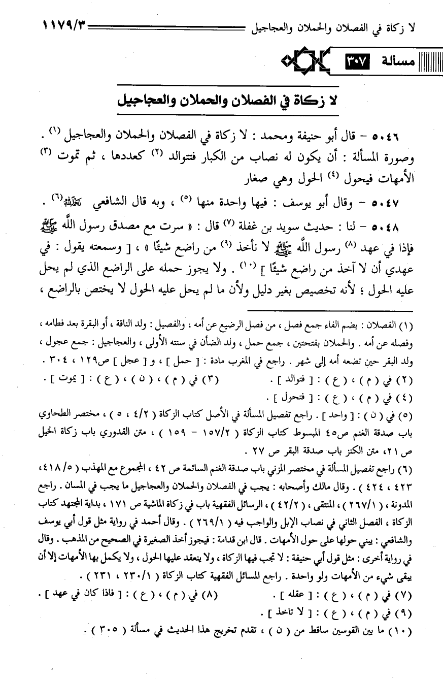 5046 - قال أبو حنيفة ومحمد: لا زكاة في الفصلان والحملان والعجاجيل. وصورة المسألة: أن يكون له نصاب من الكبار فتتوالد كعددها، ثم تموت الأمهات فيحول الحول وهي صغار.
