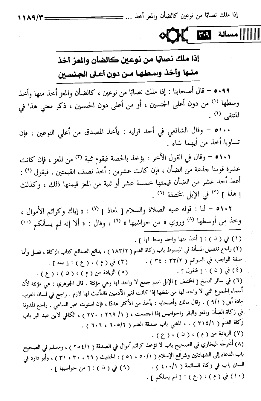 5099 - قال أصحابنا: إذا ملك نصابا من نوعين، كالضأن والمعز أخذ منها وأخذ وسطها من دون أعلى الجنسين، أو من أعلى دون الجنسين، ذكر معنى هذا في المنتقى.