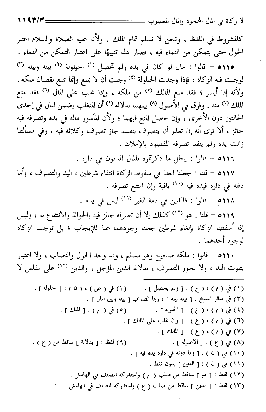 5119 - قلنا: هو كذلك إلا أن تصرفه جائز فيه بالحوالة والانتفاع به، وليس إذا أسقطنا الزكاة بإلغاء شرطين جعلنا وجودهما علة للإيجاب؛ بل توجب الزكاة لوجود أحدهما.
