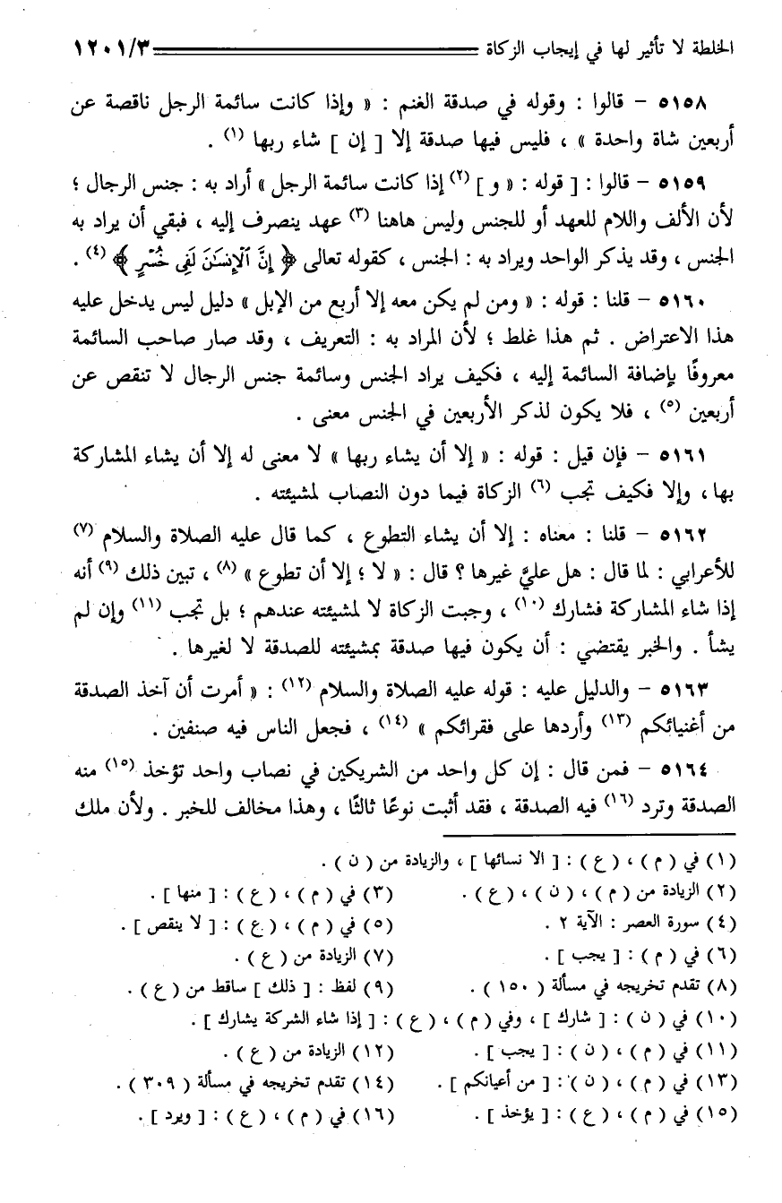 5161 - فإن قيل: قوله: (إلا أن يشاء ربها) لا معنى له إلا أن يشاء المشاركة بها، وإلا فكيف تجب الزكاة فيما دون النصاب لمشيئته.