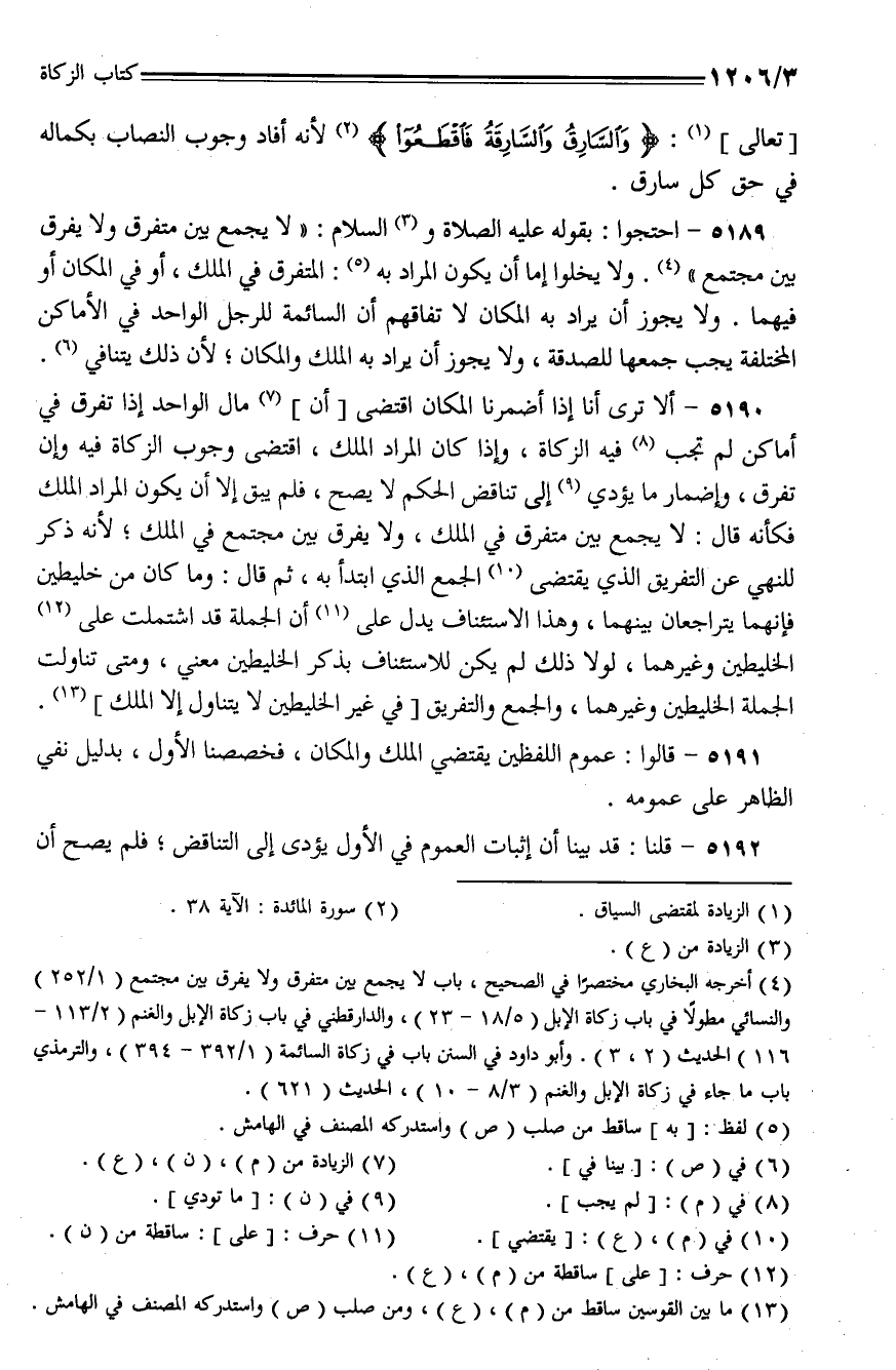 5190 - ألا ترى أنا إذا أضمرنا المكان اقتضى [أن] مال الواحد إذا تفرق في أماكن لم تجب فيه الزكاة، وإذا كان المراد الملك، اقتضى وجوب الزكاة فيه وإن تفرق، وإضمار ما يؤدي إلى تناقض الحكم لا يصح، فلم يبق إلا أن يكون المراد الملك فكأنه قال: لا يجمع بين مفترق في الملك، ولا يفرق بين مجتمع في الملك؛ لأنه ذكر للنهي ع التفريق الذي يقتضي الجمع الذي ابتدأ به، ثم قال: وما كان من خليطين فإنهما يتراجعان بينهما، وهذا الاستئناف يدل على أن الجملة قد اشتملت على الخليطين وغيرهما، لولا ذلك لم يكن للاستئناف بذكر الخليطين معنى، ومتى تناولت الجملة الخليطين وغيرهما، والجمع والتفريق [في غير الخليطين لا يتناول إلا الملك].