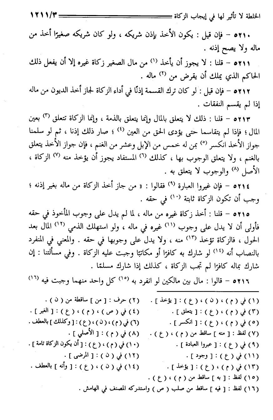 5215 - قلنا: أخذ زكاة غيره من ماله، لما لم يدل على وجوب المأخوذ في حقه فأولى أن لا يدل على وجوب غيره في ماله، ولو استهلك الذمي المال بعد الحول، فالزكاة تؤخذ منه، ولا يدل على وجوبها في حقه. والمعنى في المنفرد بالنصاب أنه لو شارك به كافرا أو مكاتبا وجبت عليه الزكاة. وفي مسألتنا: إن شارك بماله كافرا لم تجب الزكاة، كذلك إذا شارك مسلما.