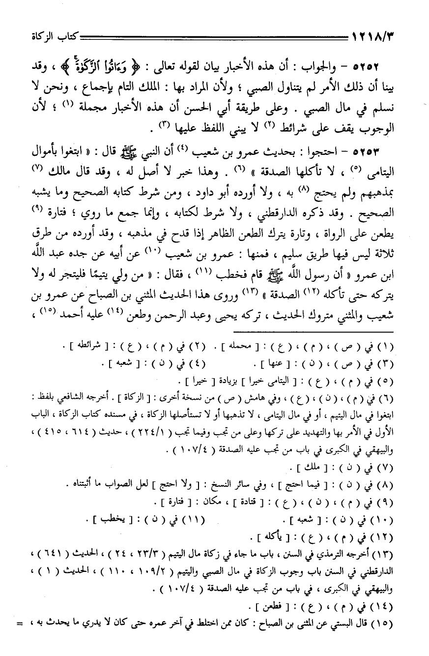 5252 - والجواب: أن هذه الأخبار بيان لقوله تعالى: {وآتوا الزكاة}، وقد بينا أن ذلك الأمر لم يتناول الصبي؛ ولأن المراد بها: الملك التام بإجماع، ونحن لا نسلم في مال الصبي. وعلى طريقة أبي الحسن أن هذه الأخبار مجملة؛ لأن الوجوب يقف على شرائط لا يبنى اللفظ عليها.