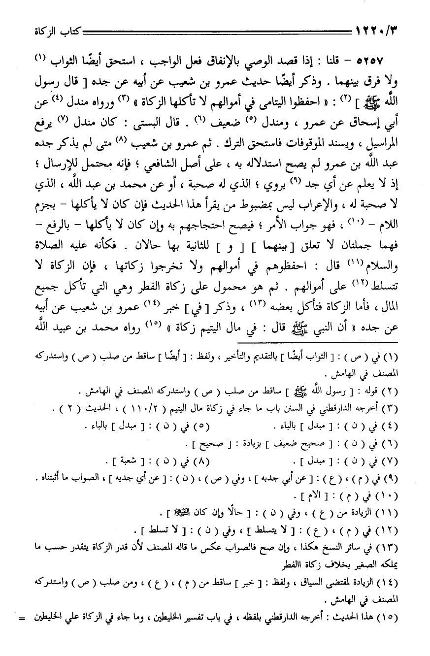 5257 - قلنا: إذا قصد الوصي بالإنفاق فعل الواجب، استحق أيضا الثواب ولا فرق بينهما. وذكر أيضا حديث عمرو بن شعيب عن أبيه عن جده [قال رسول الله - صلى الله عليه وسلم -]: (احفظوا اليتامى في أموالهم لا تأكلها الزكاة) ورواه مندل عن أبي إسحاق عن عمرو، ومندل ضعيف. قال البستي: كان مندل يرفع المراسيل، ويسند الموقوفات فاستحق الترك. ثم عمرو بن شعيب متى لم يذكر جده عبد الله بن عمرو لم يصح استدلاله، على أصل الشافعي؛ فإنه محتمل للإرسال؛ إذ لا يعلم عن أي جد يروي؛ الذي له صحبة، أو عن محمد بن عبد الله، الذي لا صحبة له، والإعراب ليس بمضبوط من يقرأ هذا الحديث فإن كان لا يأكلها- بجزم اللام-، فهو جواب الأمر؛ فيصح احتجاجهم به وإن كان لا يأكلها- بالرفع- فهما جملتان لا تعلق [بينهما] [و] للثانية بها حالان. فكأنه عليه الصلاة والسلام قال: احفظوهم في أموالهم ولا تخرجوا زكاتها، فإن الزكاة لا تتسلط على أموالهم. ثم هو محمول على زكاة الفطر وهي التي تأكل جميع المال، فأما الزكاة فتأكل بعضه، وذكر [في] خبر عمرو بن شعيب عن أبيه عن جده (أن النبي - صلى الله عليه وسلم - قال: في مال اليتيم زكاة) رواه محمد بن عبيد الله