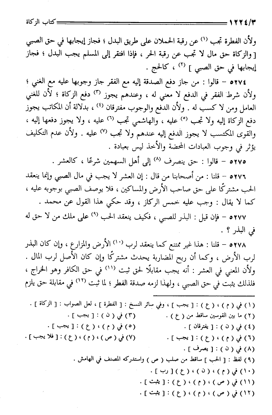 5276 - قلنا: من أصحابنا من قال: إن العشر لا يجب في مال الصبي وإنما ينعقد الحب مشتركا على حق صاحب الأرض والمساكين، فلا يوصف الصبي بوجوبه عليه، كما لا يقال: وجب عليه خمس الركاز، وقد حكي هذا القول عن محمد.