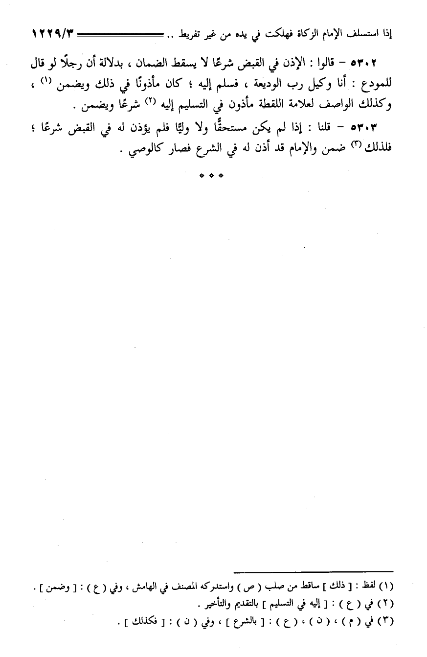 5302 - قالوا: الإذن في القبض شرعا لا يسقط الضمان، بدلالة أن رجلا لو قال للمودع: أنا وكيل رب الوديعة، فسلم إليه؛ كان مأذونا في ذلك ويضمن، وكذلك الواصف لعلامة اللقطة مأذون في التسليم إليه شرعا ويضمن.