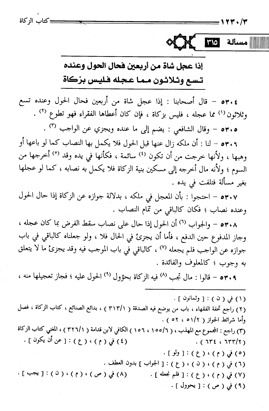 5304 - قال أصحابنا: إذا عجل شاة من أربعين فحال الحول وعنده تسع وثلاثون مما عجله، فليس بزكاة، فإن كان أعطاها الفقراء فهو تطوع.