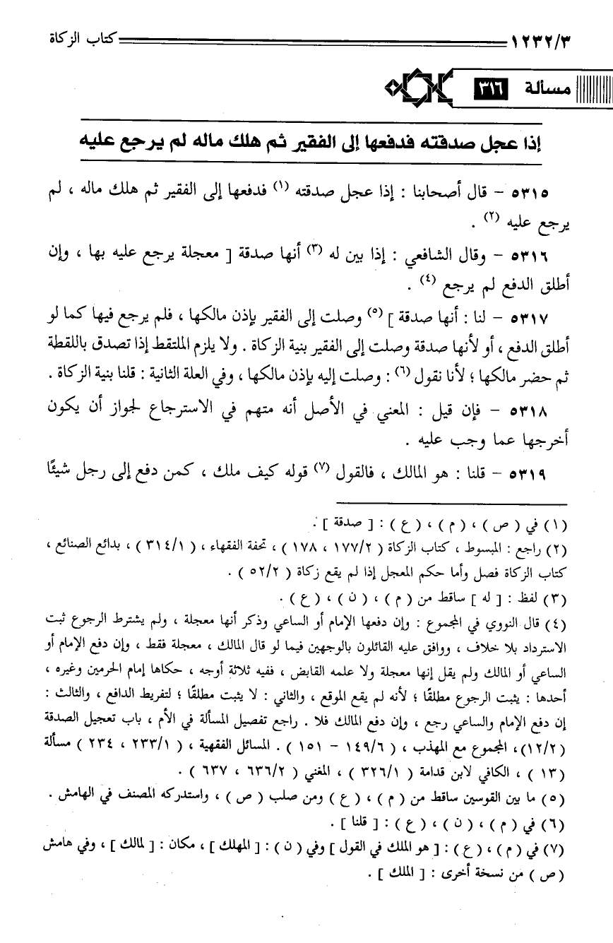 5315 - قال أصحابنا: إذا عجل صدقته فدفعها إلى الفقير ثم هلك ماله، لم يرجع عليه.