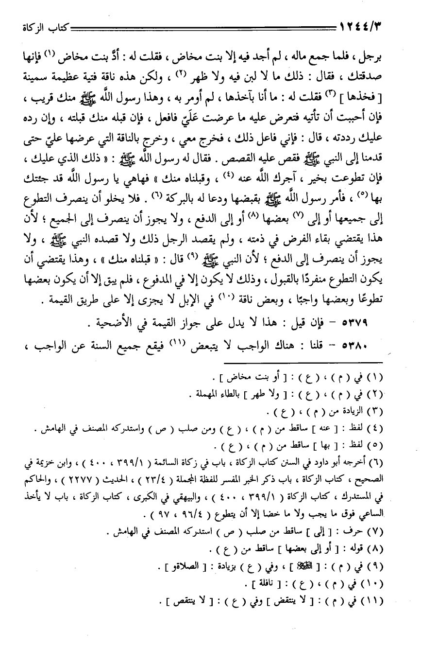 برجل، فلما جمع ماله، لم أجد فيه إلا بنت مخاض، فقلت له: أد بنت مخاض فإنها صدقتك، فقال: ذلك ما لا لبن فيه ولا ظهر، ولكن هذه ناقة فتية عظيمة سمينة [فخذها] فقلت له: ما أنا بآخذها، لم أومر به، وهذا رسول الله - صلى الله عليه وسلم - منك قريب، فإن أحببت أن تأتيه فتعرض عليه ما عرضت علي فافعل، فإن قبله منك قبلته، وإن رده عليه رددته، قال: فإني فاعل ذلك، فخرج معي، وخرج بالناقة التي عرضها علي حتى قدمنا إلى النبي - صلى الله عليه وسلم - فقص عليه القصص. فقال له رسول الله - صلى الله عليه وسلم -: (ذلك الذي عليك، فإن تطوعت بخير، آجرك الله عنه، وقبلناه منك) فها هي يا رسول الله قد جئتك بها، فأمر رسول الله - صلى الله عليه وسلم - بقبضها ودعا له بالبركة. فلا يخلو أن ينصرف التطوع إلى جميعها أو إلى بعضها أو إلى الدفع، ولا يجوز أن ينصرف إلى الجميع؛ لأن هذا يقتضي بقاء الفرض في ذمته، ولم يقصد الرجل ذلك ولا قصده النبي - صلى الله عليه وسلم -، ولا يجوز أن ينصرف إلى الدفع؛ لأن النبي - صلى الله عليه وسلم - قال: (قبلناه منك)، وهذا يقتضي أن يكون التطوع منفردا بالقبول، وذلك لا يكون إلا في المدفوع، فلم يبق إلا أن يكون بعضها تطوعا وبعضها واجبا، وبعض ناقة في الإبل لا يجزى إلا على طريق القيمة.