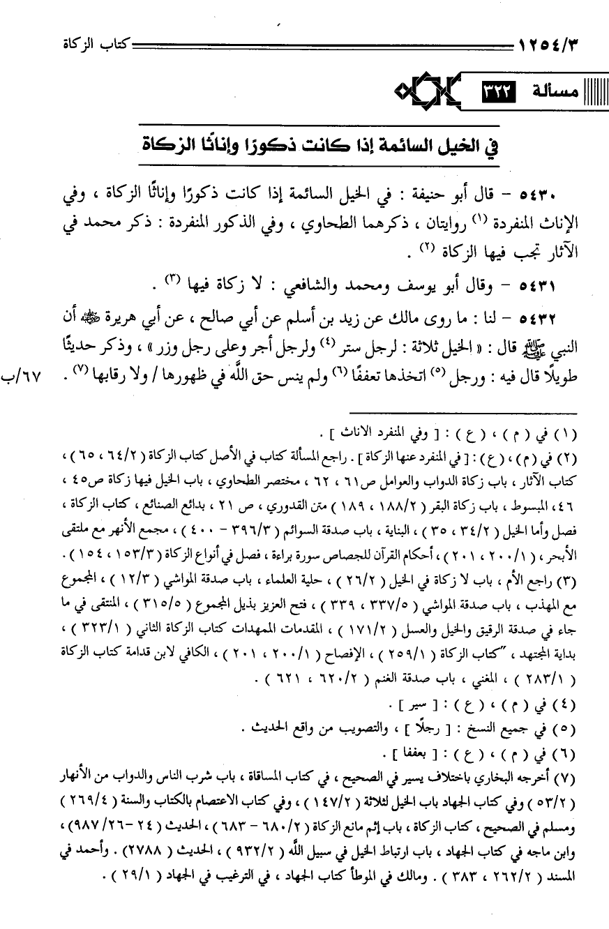 5430 - قال أبو حنيفة: في الخيل السائمة إذا كانت ذكورا وإناثا الزكاة، وفي الإناث المنفردة روايتان، ذكرهما الطحاوي، وفي الذكور المنفردة: ذكر محمد في الآثار تجب فيها الزكاة.