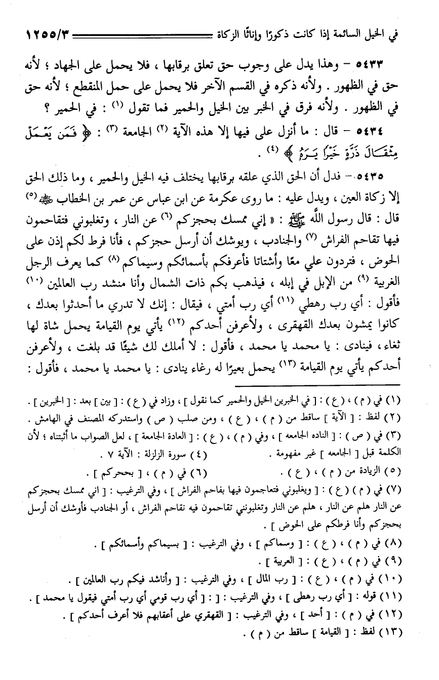 5435 - فدل أن الحق الذي علقه برقابها يختلف فيه الخيل والحمير، وما ذلك الحق إلا زكاة العين، ويدل عليه: ما روى عكرمة عن ابن عباس عن عمر بن الخطاب - رضي الله عنه -: قال رسول الله - صلى الله عليه وسلم -: (إني ممسك بحجزكم عن النار، وتغلبوني فتقاحمون فيها تقاحم الفراش والجنادب، ويوشك أن أرسل حجزكم، فأنا فرط لكم إذن على الحوض، فتردون علي معا وأشتاتا فأعرفكم بأسمائكم وسيماكم كما يعرف الرجل الغربية من الإبل في إبله، فيذهب بكم ذات الشمال وأنا منشد رب العالمين فأقول: أي رب رهطي أي رب أمتي، فيقال: إنك لا تدري ما أحدثوا بعدك، كانوا يمشون بعدك القهقري، ولأعرفن أحدكم يأتي يوم القيامة يحمل شاة لها ثغاء، فينادى: يا محمد يا محمد، فأقول: لا أملك لك شيئا قد بلغت، ولأعرفن أحدكم يأتي يوم القيامة يحمل بعيرا له رغاء ينادى: يا محمد يا محمد، فأقول: