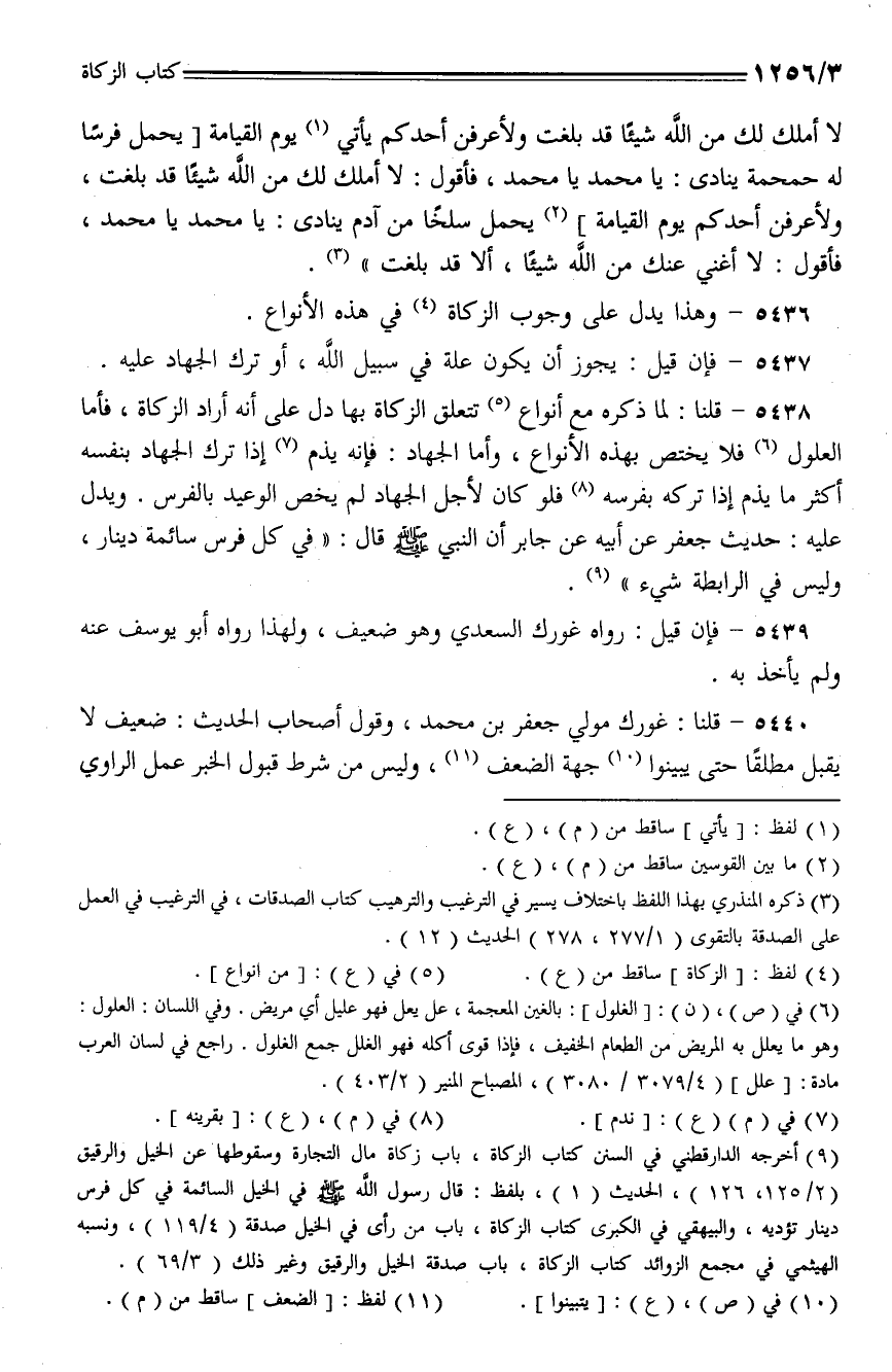5438 - قلنا: لما ذكره مع أنواع تتعلق الزكاة بها دل على أنه أراد الزكاة، فأما العلول فلا يختص بهذه الأنواع، وأما الجهاد: فإنه يذم إذا ترك الجهاد بنفسه أكثر ما يذم إذا تركه بفرسه فلو كان لأجل الجهاد لم يخص الوعيد بالفرس. ويدل عليه: حديث جعفر عن أبيه عن جابر أن النبي - صلى الله عليه وسلم - قال: (في كل فرس سائمة دينار، وليس في الرابطة شيء).