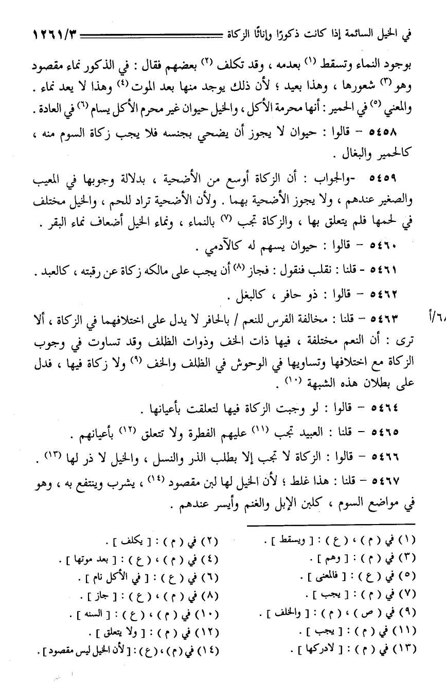 5466 - قالوا: الزكاة لا تجب إلا بطلب الذر والنسل، والخيل لا ذر لها.