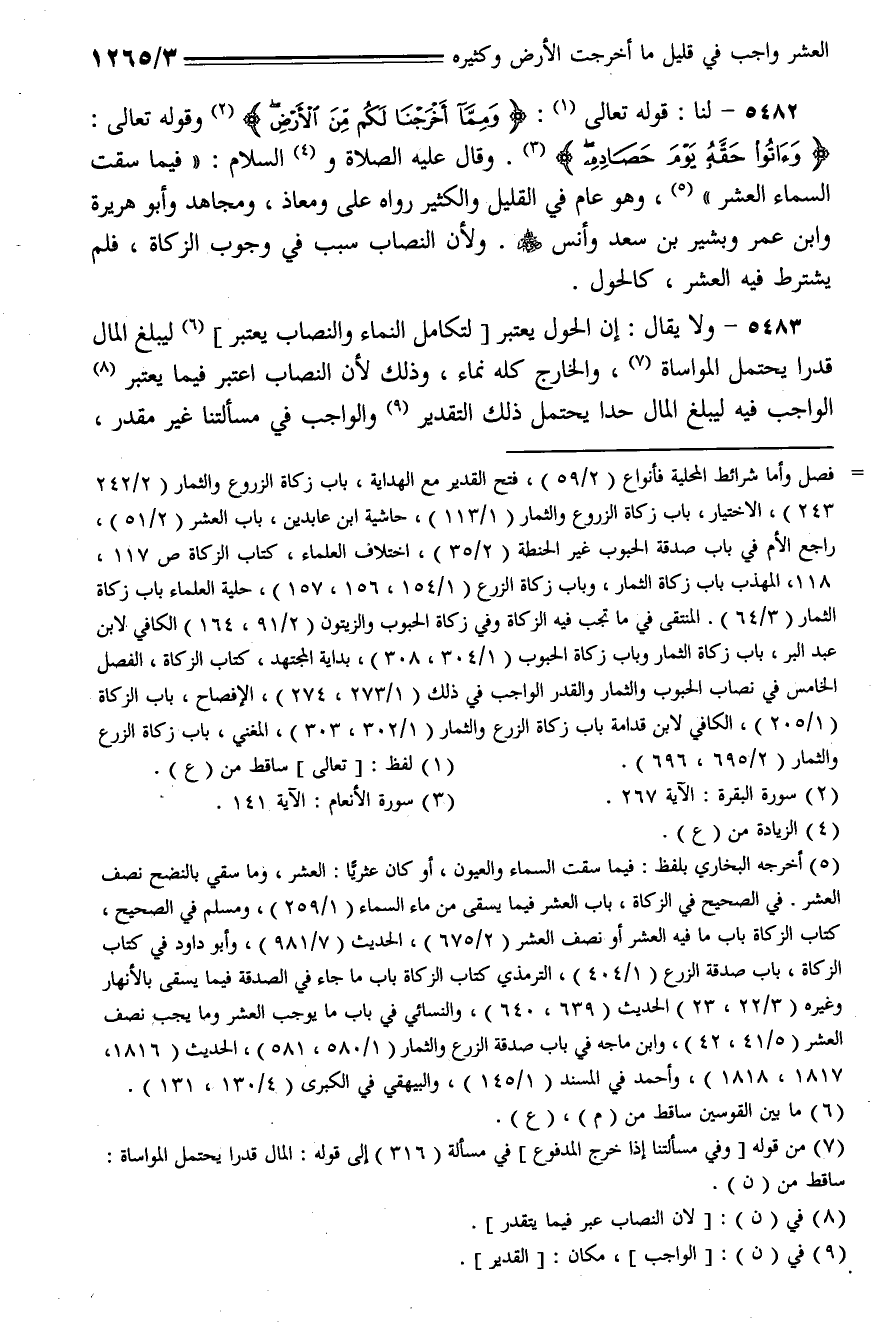 5483 - ولا يقال: إن الحول يعتبر [لتكامل النماء والنصاب يعتبر] ليبلغ المال قدرا يحتمل المواساة، والخارج كله نماء، وذلك لأن النصاب اعتبر فيما يعتبر الواجب فيه ليبلغ المال حدا يحتمل ذلك التقدير والواجب في مسألتنا غير مقدر،