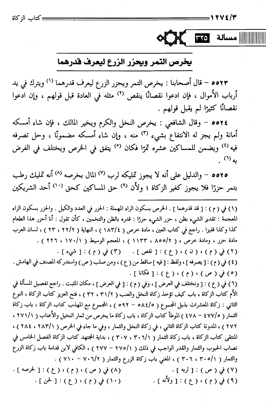 5523 - قال أصحابنا: يخرص التمر ويحزر الزرع ليعرف قدرهما ويترك في يد أرباب الأموال، فإن ادعوا نقصانا ينقص مثله في العادة قبل قولهم، وإن ادعوا نقصانا كثيرا لم يقبل قولهم.