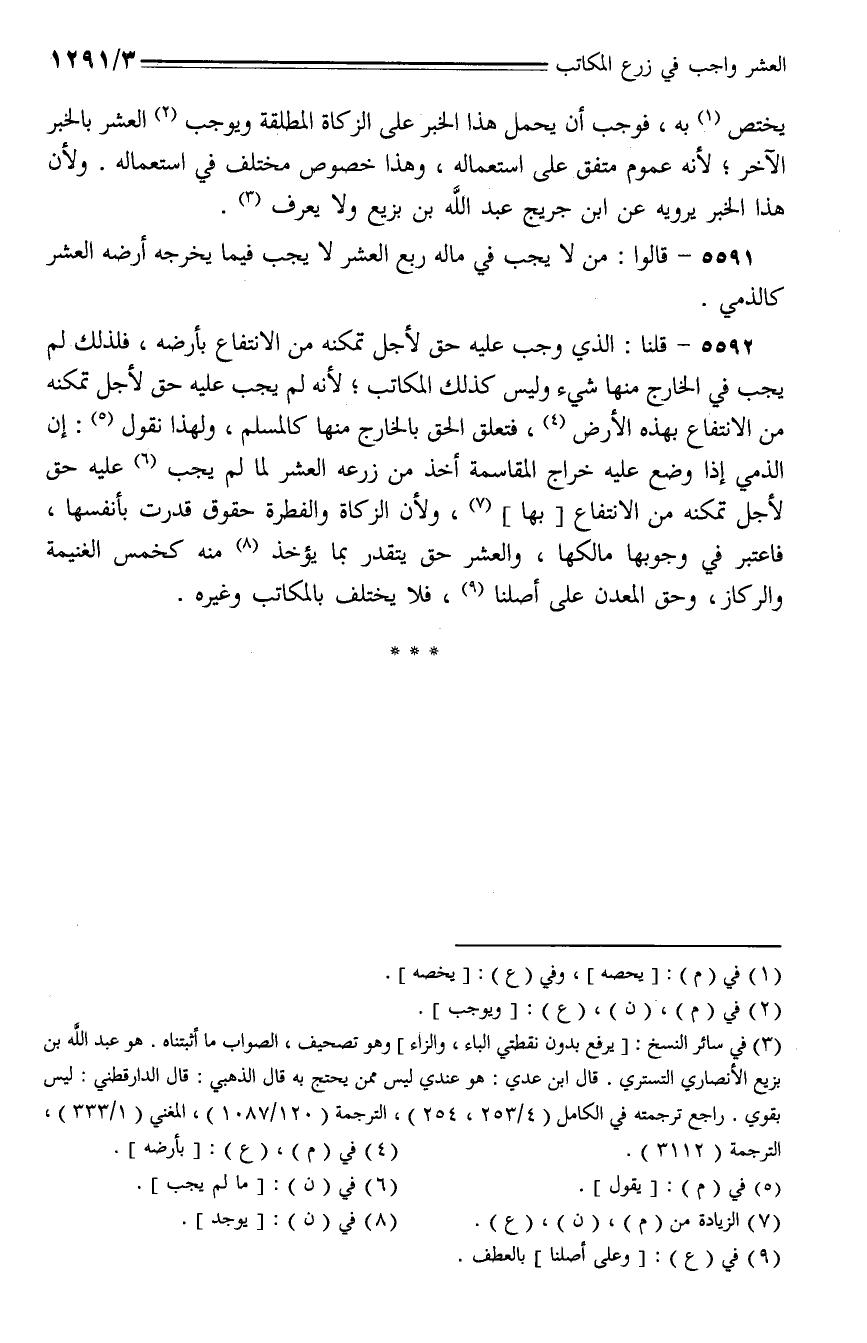 5591 - قالوا: من لا يجب في ماله ربع العشر لا يجب فيما يخرجه أرضه العشر كالذمي.
