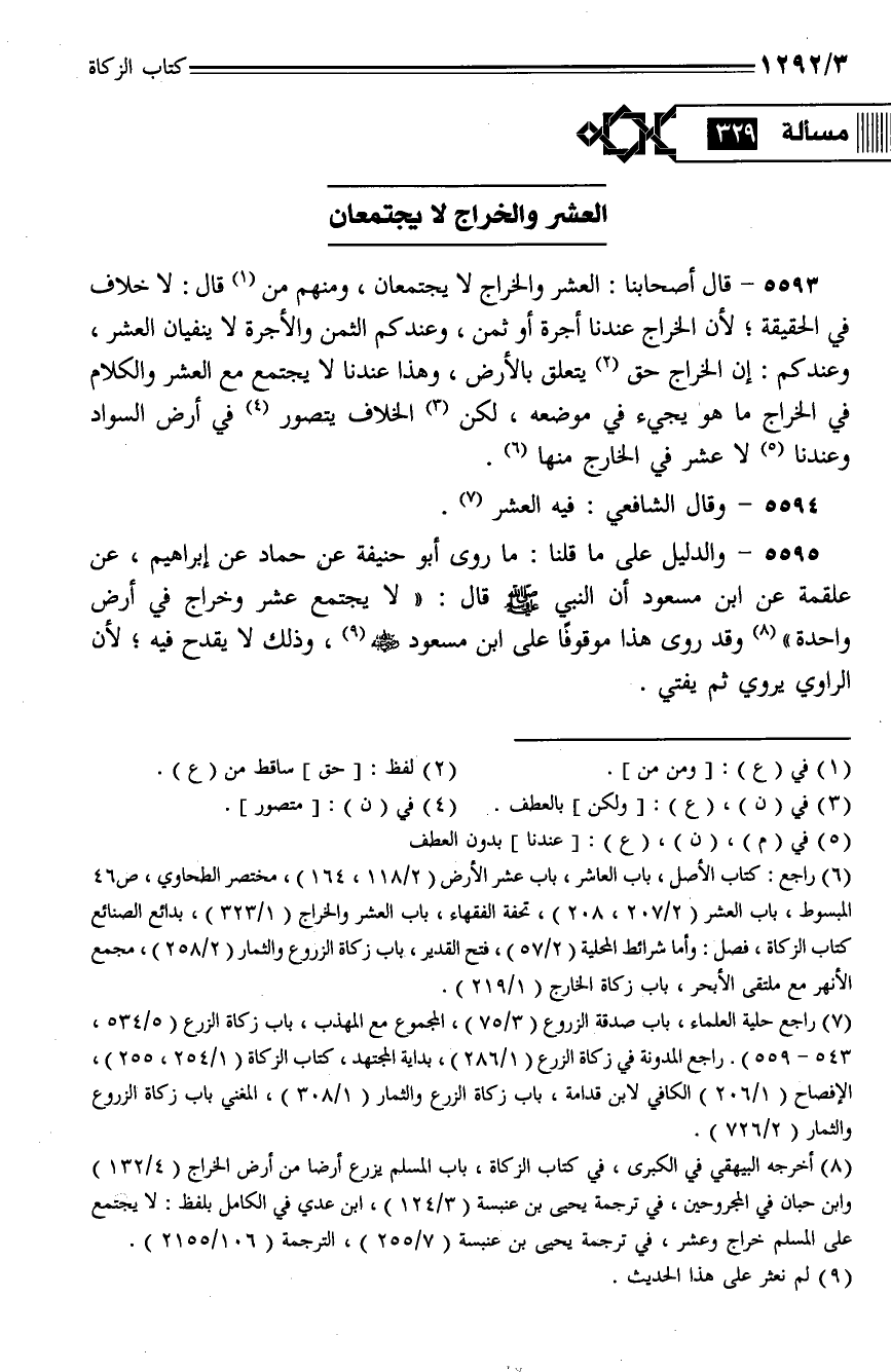 5593 - قال أصحابنا: العشر والخراج لا يجتمعان، ومنهم من قال: لا خلاف في الحقيقة؛ لأن الخراج عندنا أجرة أو ثمن، وعندكم الثمن والأجرة لا ينفيان العشر، وعندك: إن الخراج حق يتعلق بالأرض، وهذا عندنا لا يجتمع مع العشر والكلام في الخراج ما هو يجي في موضعه، لكن الخلاف يتصور في أرض السواد وعندنا لا عشر في الخارج منها.