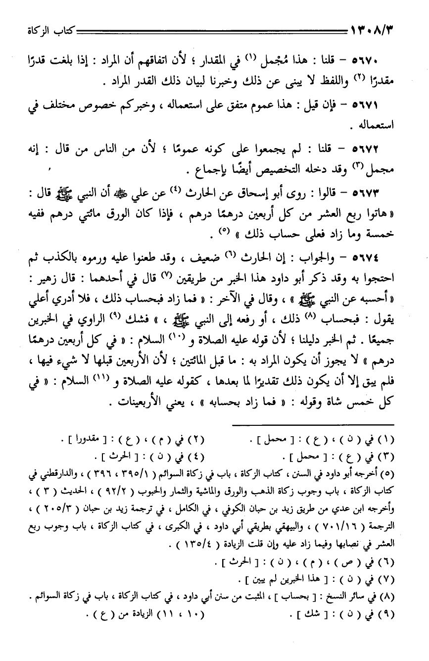 5674 - والجواب: إن الحارث ضعيف، وقد طعنوا عليه ورموه بالكذب ثم احتجوا به وقد ذكر أبو داود هذا الخبر من طريقين قال في أحدهما: قال زهير: (أحسبه عن النبي - صلى الله عليه وسلم -)، وقال في الآخر: (فما زاد فبحساب ذلك، فلا أدري أعلي يقول: فبحساب ذلك، أو رفعه إلى النبي - صلى الله عليه وسلم -،) فشك الراوي في الخبرين جميعا. ثم الخبر دليلنا؛ لأن قوله عليه الصلاة والسلام: (في كل أربعين درهما درهم) لا يجوز أن يكون المراد به: ما قبل المائتين؛ لأن الأربعين قبلها لا شيء فيها، فلم يبق إلا أن يكون ذلك تقديرا لما بعدها، كقوله عليه الصلاة والسلام: (في كل خمس شاة وقوله: (فما زاد بحسابه)، يعني الأربعينات.