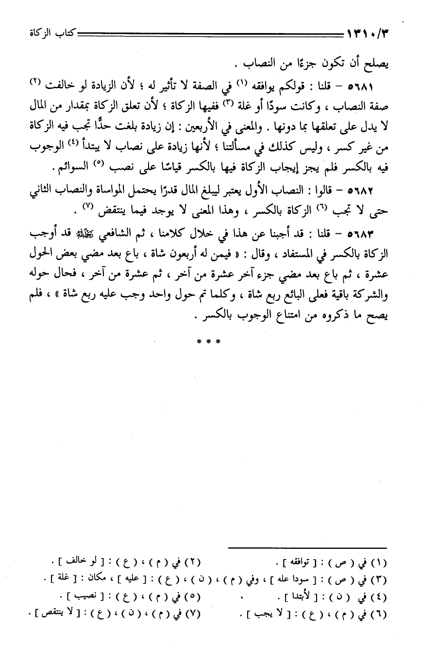 5683 - قلنا: قد أجبنا عن هذا في خلال كلامنا، ثم الشافعي رحمه الله قد أوجب الزكاة بالكسر في المستفاد، وقتل: (فيمن له أربعون شاة، باع معد مضي بعض الحول عشرة، ثم باع بعد مضي جزء آخر عشرة من آخر، ثم عشرة من آخر، فحال حوله والشركة باقية فعلى البائع ربع شاة، وكلما تم حول واحد وجب عليه ربع شاة)، فلم يصح ما ذكروه من امتناع الوجوب بالكسر.