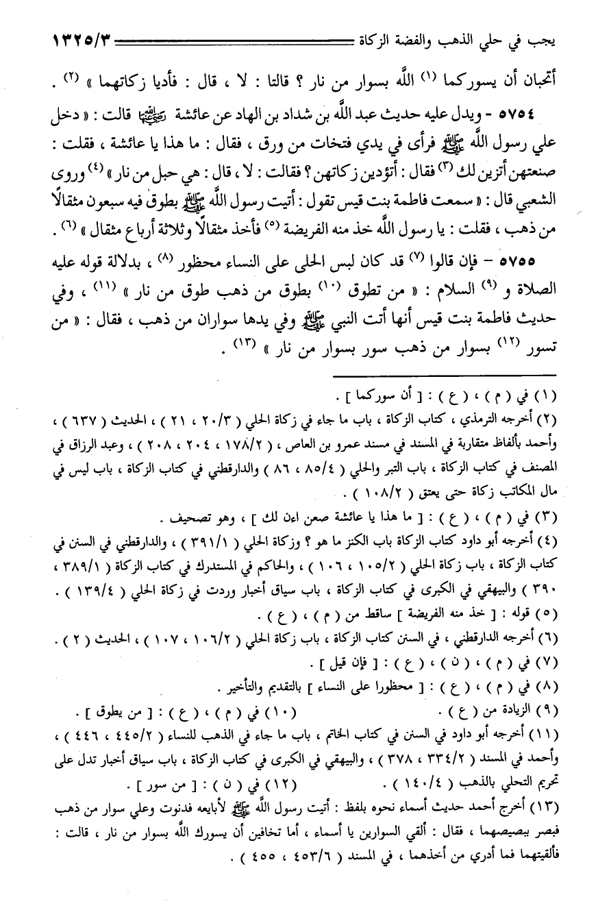 5754 - ويدل عليه حديث عبد الله بن شداد بن الهاد عن عائشة رضي الله عنها قالت: (دخل علي رسول الله - صلى الله عليه وسلم - فرأى في يدي فتخات من ورق، فقال: ما هذا يا عائشة: فقلت: صنعتهن أتزين لك فقال: أتؤدين زكاتهن؟ فقال: لا، قال: حي حبل من نار) وروى الشعبي قال: (سمعت فاطمة بنت قيس تقول: أتيت رسول الله - صلى الله عليه وسلم - بطوق فيه سبعون مثقالا من ذهب، فقلت: يا رسول الله خذ منه الفريضة فأخذ مثقالا وثلاثة أرباع مثقال).