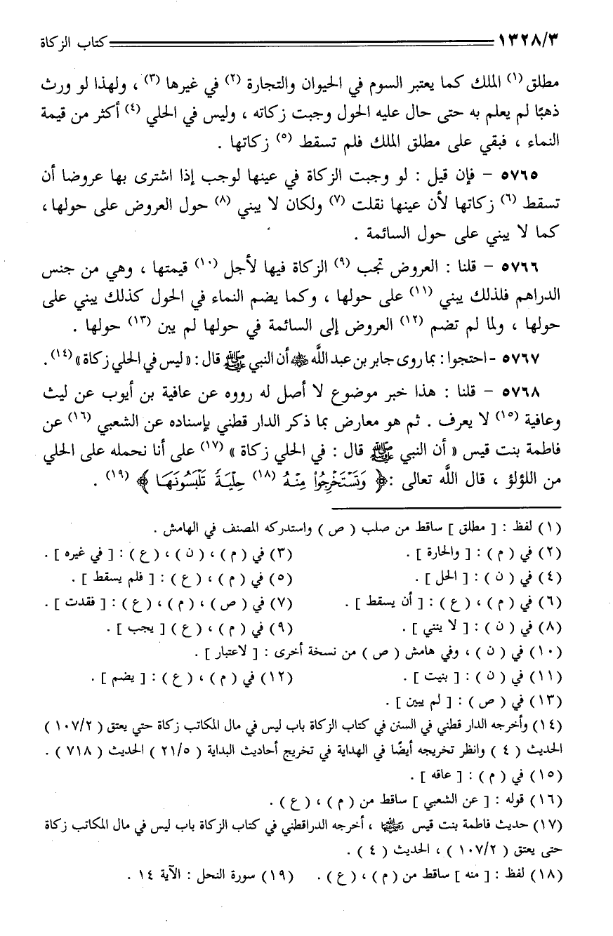 5768 - قلنا: هذا خبر موضوع لا أصل له رووه عن عافية بن أيوب عن ليث وعافية لا يعرف. ثم هو معارض بما ذكر الدارقطني بإسناده عن الشعبي عن فاطمة بنت قيس (أن النبي - صلى الله عليه وسلم - قال: في الحلي زكاة) على أنها نحمله على الحلي من اللؤلؤ، قال الله تعالى: {وتستخرجوا منه حلية تلبسونها}.
